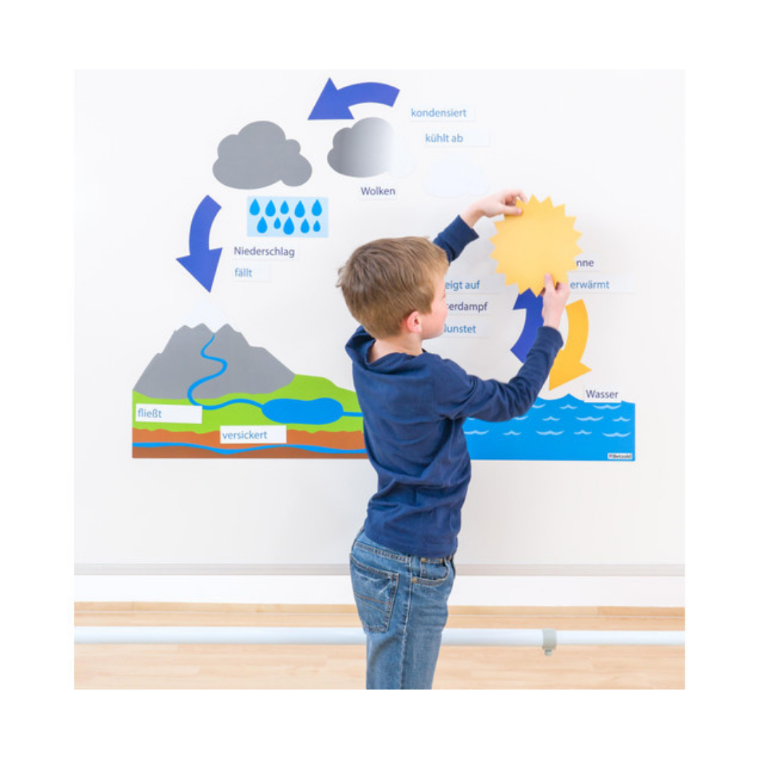 With the large water cycle for the blackboard you can easily and clearly show the constant movement of water – above and below the ground. The children get to know the