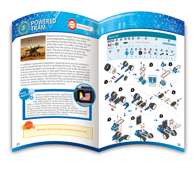 Follow the instructional manual, kids can build up to 16 models that are designed for different AI applications. With the Web:AI cloud intelligence platform, kids can use drag-and-drop coding blocks to program the models they just built to perform various AI tasks.