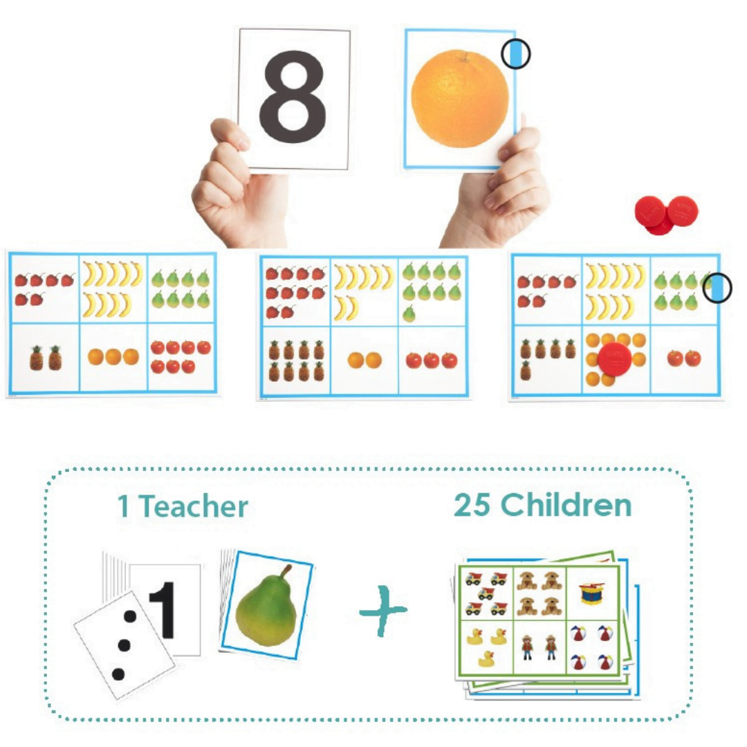 A game for the whole class (up to 25 CHILDREN) for learning to count from 1 to 10 and associating the writing of the numbers 1 to 10 with their respective amounts. The teacher shows two cards at random: a number and an object, and the children who have the corresponding object and number shown by the teacher on their bingo card put a tick in the relevant box on their card, and so on, until the first person completes all 6 boxes on their card. The game consists of 25 two-sided cards for the students 22 cards for the teacher 150 round counters. Includes TEACHING AND ACTIVITY GUIDE. Easy to use! Learn to count by playing!