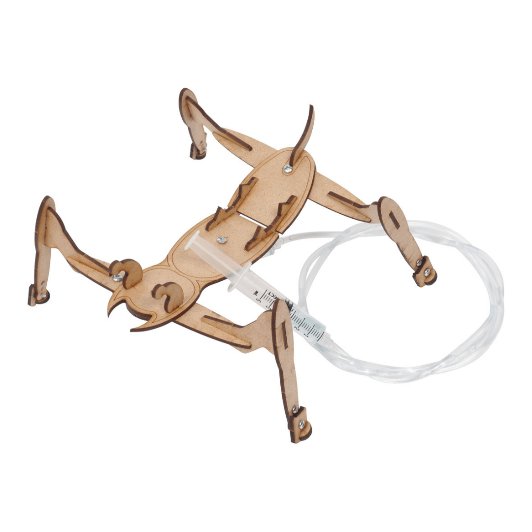 This crawling critter (C-Bot Crawler Bot) isn’t a pest – it’s a fun kit that utilizes mechanics and water power to crawl across the floor or other flat surfaces. After it is built, just push the plunger back and forth to move the C-Bot forward. Great for demonstrating Newton’s third law of motion, basic hydraulics, and other concepts. Laser-cut parts glue together to create subassemblies, which are then screwed together. Requires white glue, cool-melt glue gun and glue, small screwdriver (all sold separately), and water.