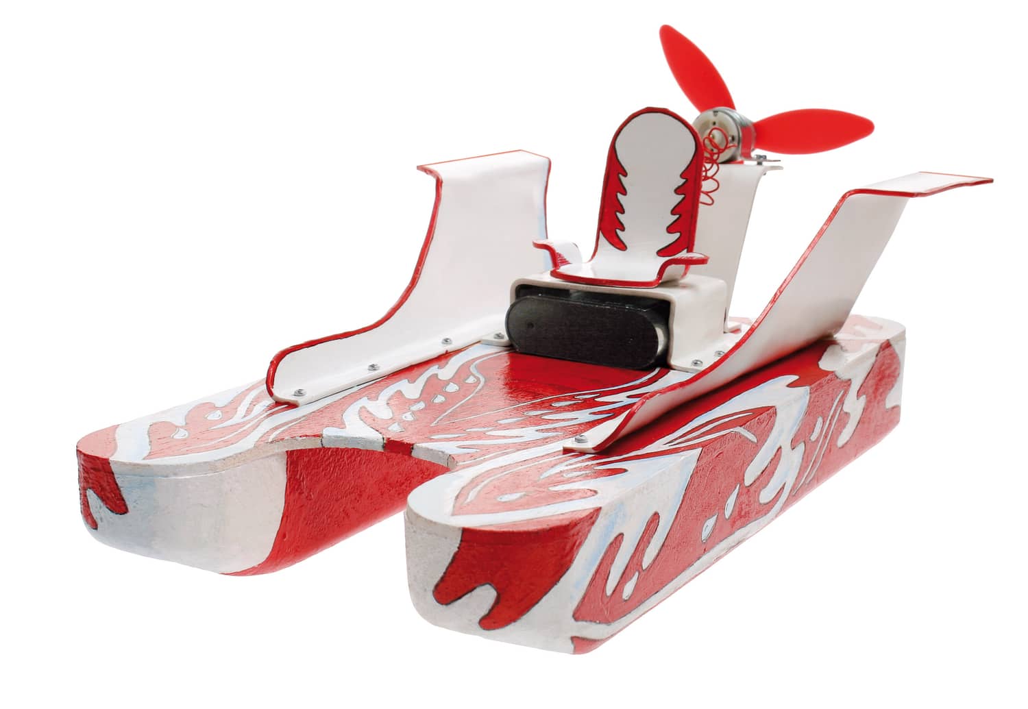 The fins and seat, battery holder are formed from 2mm Polystyrol. Power for the catamaran is supplied by a DC motor and propellor
