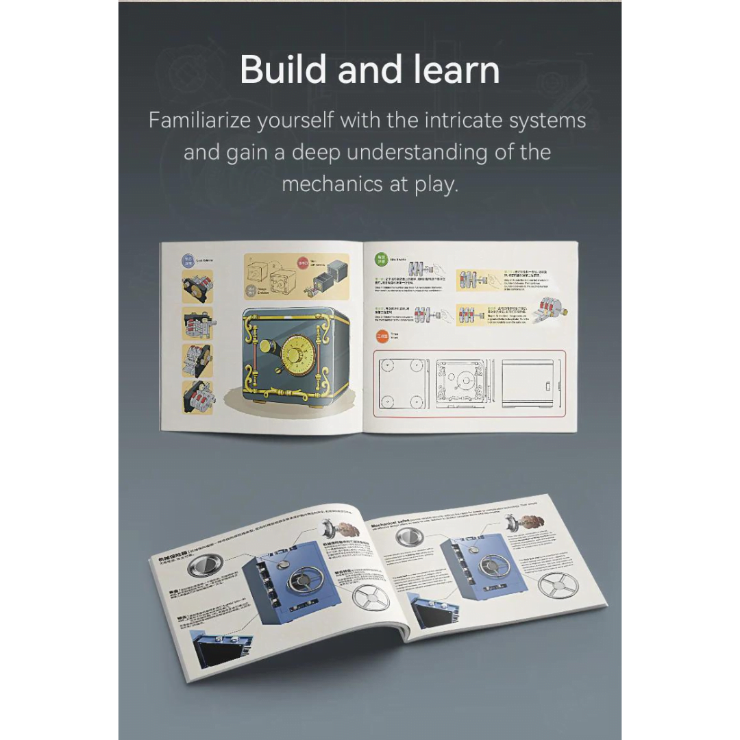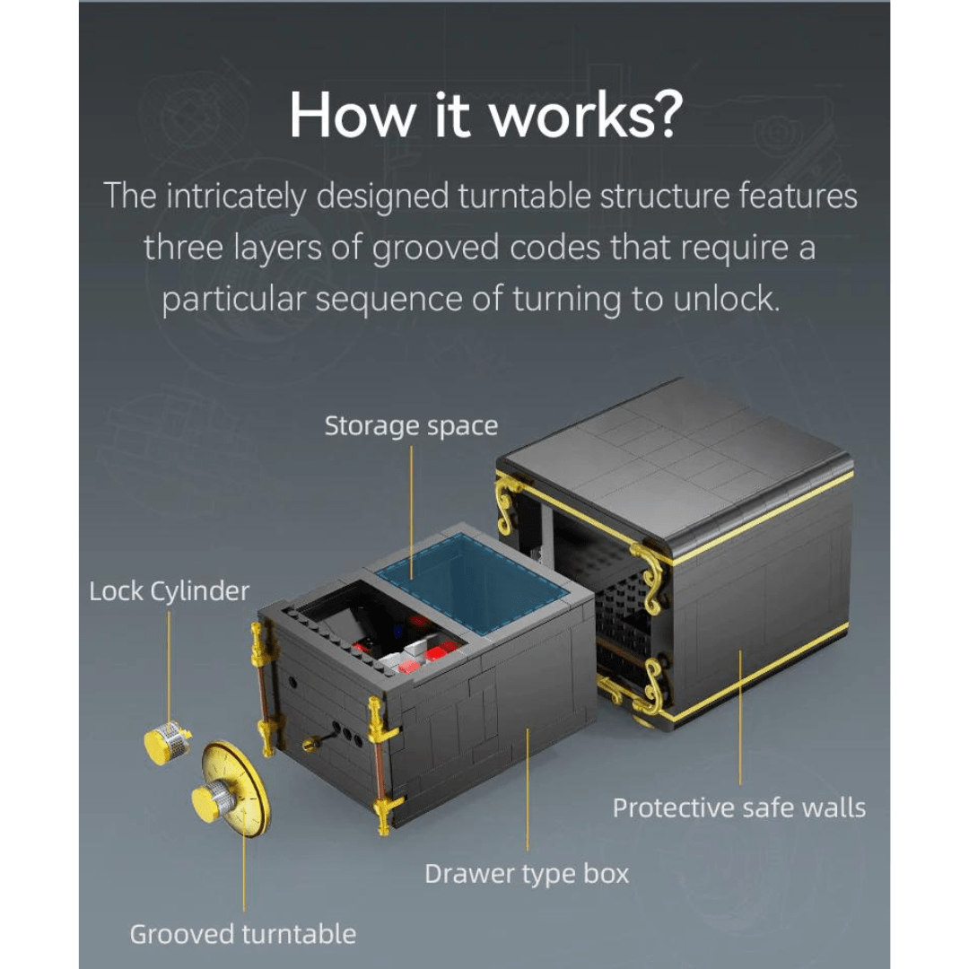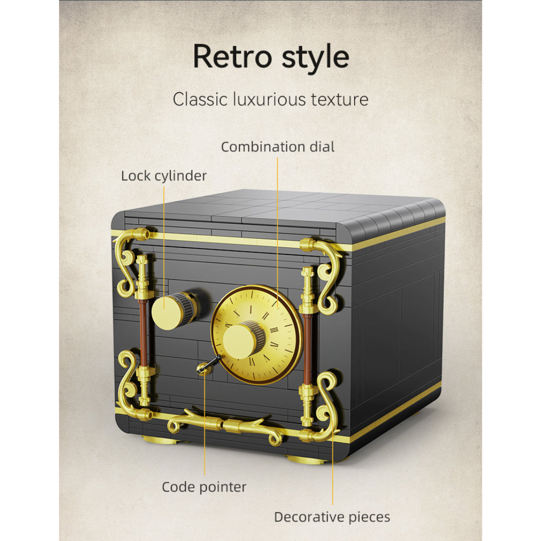 Combination Safe Discover the creativity and innovation behind this 442-pieces building block set that lets you assemble a stunning antique-style safe with a fully functional combination lock. Designed by the same mastermind behind the renowned solar system, this set takes a different approach but offers an equally captivating experience. Delight in the intricate mechanism and the thrill of putting together your own working safe. The principle and structure of a real safe are restored through blocks: it contains three layers of dial codes with grooves, and only by fluctuating the correct dial code, in turn, can the grooves be aligned with the lock core, so that the lock can be opened by the knob linkage. Storage space included: Items can be stored and encrypted for safekeeping. Mechanical knowledge learning: clever mechanical design, with manuscript-style inserts to introduce the user to the building process to learn the mechanical principles of real safes Difficulty: Low Pieces: 442 Product Size: L14.7-W12.8-H11.5cm
