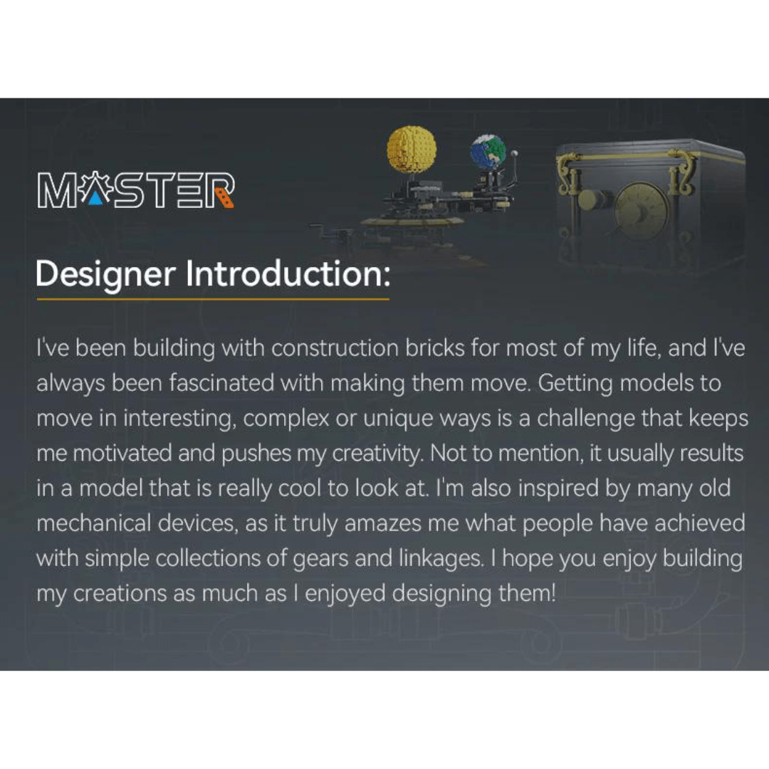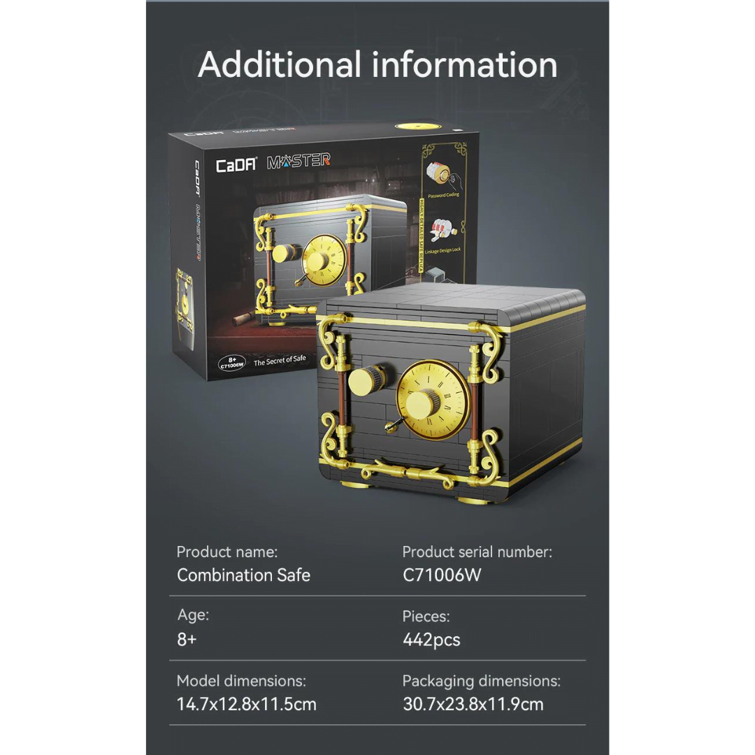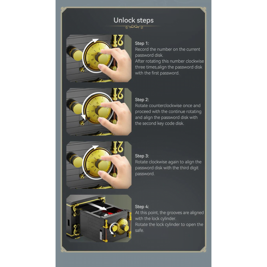 Combination Safe Discover the creativity and innovation behind this 442-pieces building block set that lets you assemble a stunning antique-style safe with a fully functional combination lock. Designed by the same mastermind behind the renowned solar system, this set takes a different approach but offers an equally captivating experience. Delight in the intricate mechanism and the thrill of putting together your own working safe. The principle and structure of a real safe are restored through blocks: it contains three layers of dial codes with grooves, and only by fluctuating the correct dial code, in turn, can the grooves be aligned with the lock core, so that the lock can be opened by the knob linkage. Storage space included: Items can be stored and encrypted for safekeeping. Mechanical knowledge learning: clever mechanical design, with manuscript-style inserts to introduce the user to the building process to learn the mechanical principles of real safes Difficulty: Low Pieces: 442 Product Size: L14.7-W12.8-H11.5cm