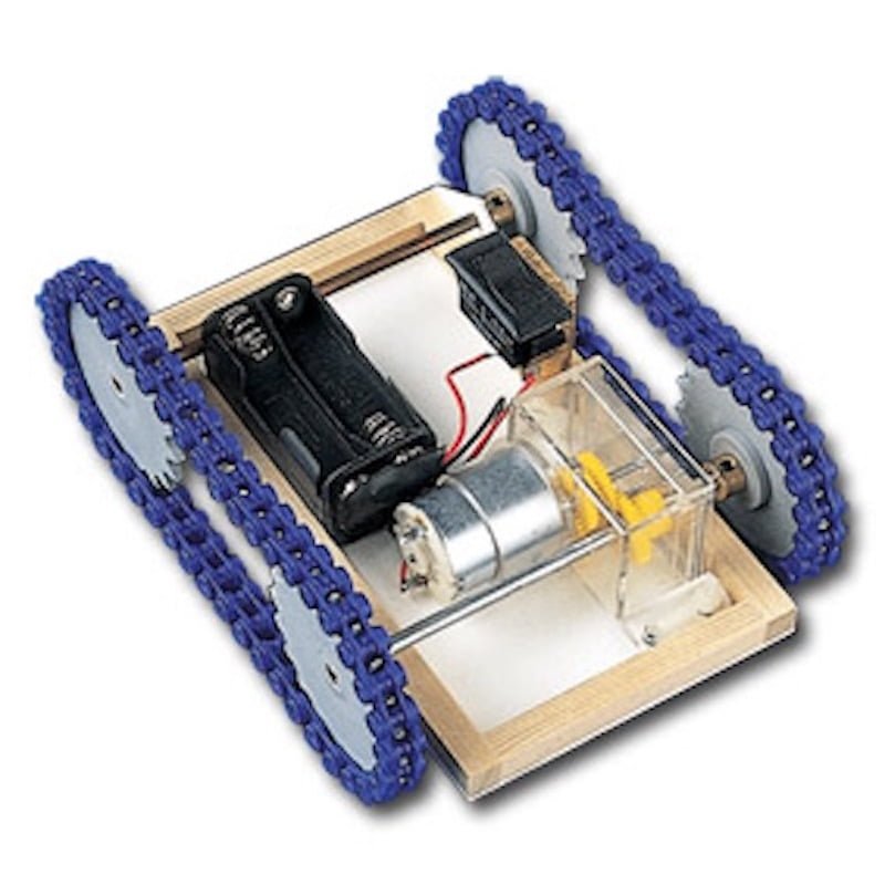 The kit contains all the necessary materials (except self-adhesive tapes, tools and batteries) to build a car that works with batteries.