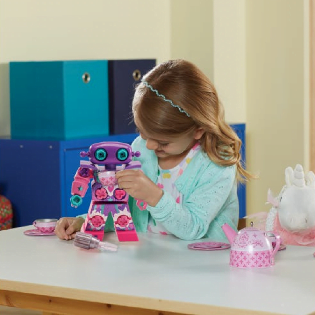 Get your glitter on! The Design & Drill(R) SparkleBot is where construction and creativity meet! Build your robot, screw in the multicolored bolts, and customize your creation with glittery stickers.