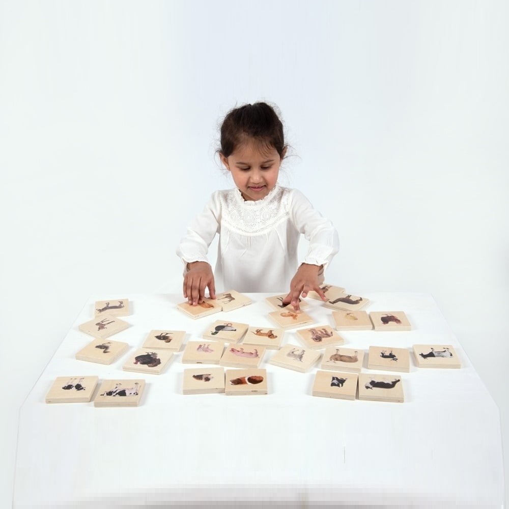 Domestic Animal Family Match is a set of 14 pairs of smooth and tactile beech plywood square tiles, each colour printed on one side with clear detailed photographic images of real domestic animal adults and their young.