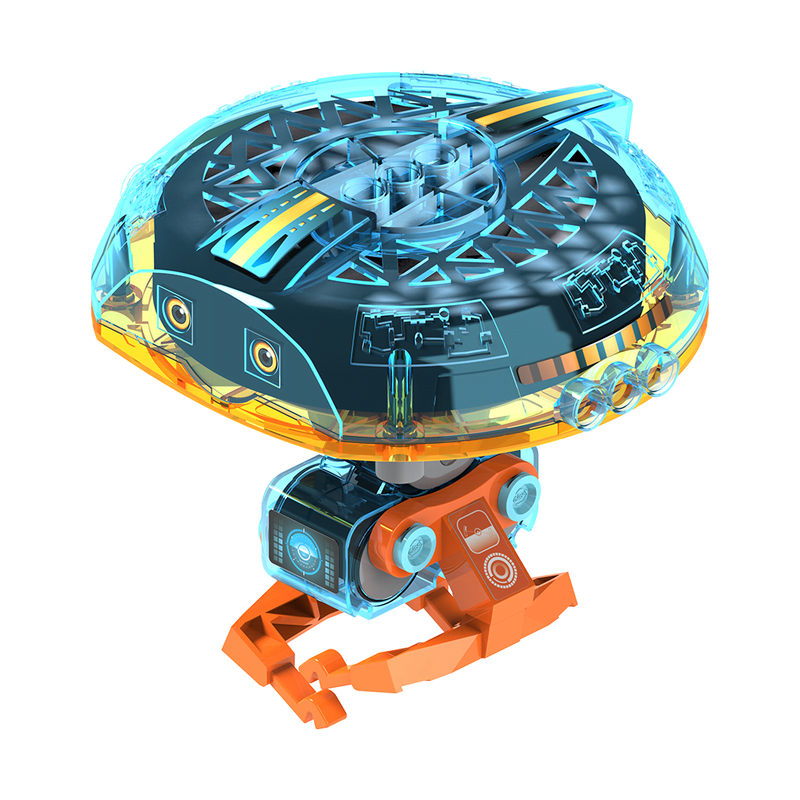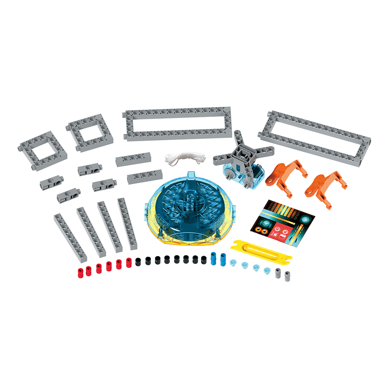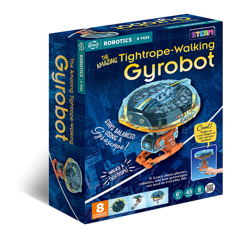 A robot fit for the circus! With this kit, you can build a robot that walks step by step along a tightrope. How? Thanks to the robot’s main component, a gyroscope, it can maintain its balance and perform this fun trick without falling over! Through eight experiments, you can explore the astonishing powers of the motorized gyroscope and understand the physics behind its amazing behaviors. Experiment with getting the robot to walk on different surfaces: a tightrope, on a solid tabletop, on a soft surface, and even on your arm! You can also experiment with the balancing behavior of the motorized gyroscope by itself, testing its ability to balance on its edge, on your finger and dangling from a string.