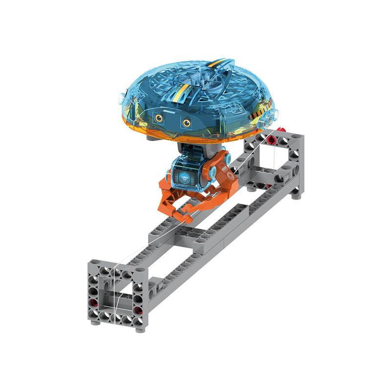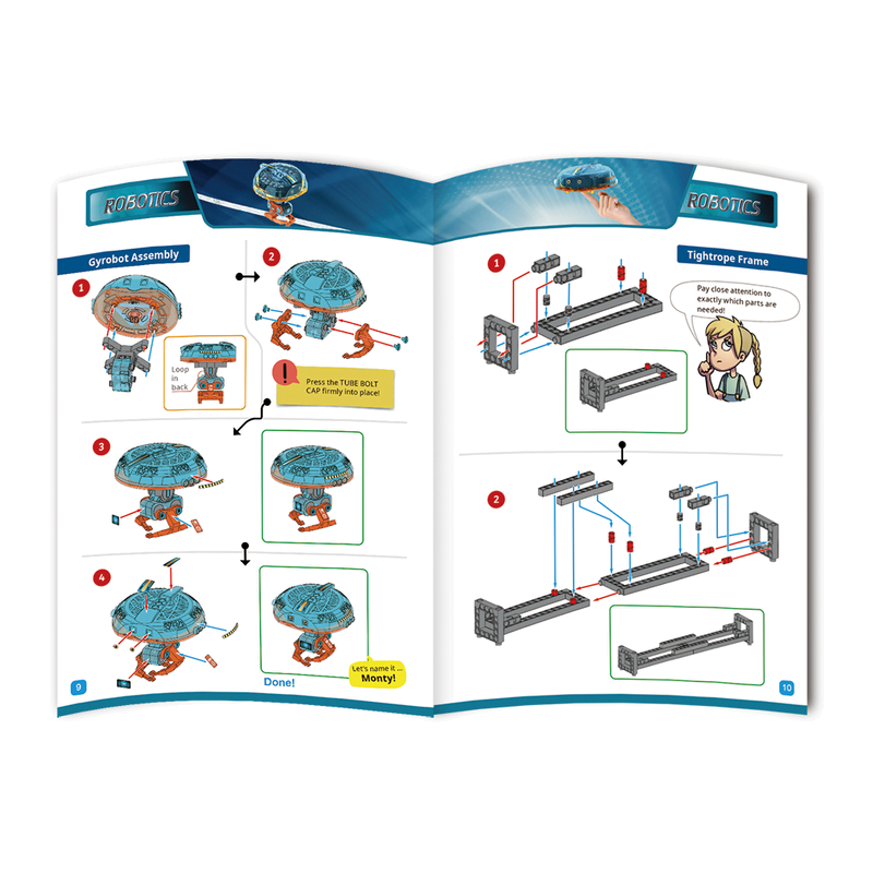 The kit includes the parts needed to build the robot and experimental setups, including a frame for the tightrope. By constructing the robot and performing the experiments with the motorized gyroscope unit, young engineers can learn about the science of gyroscopic devices and the indispensable role they play in our lives.
