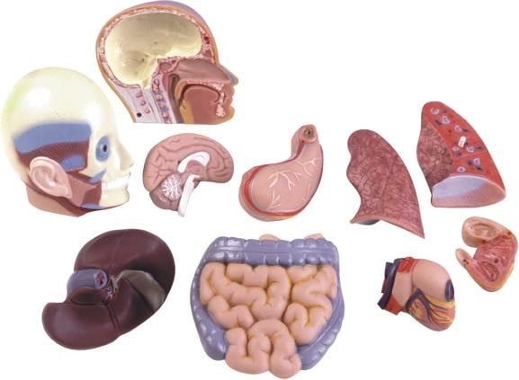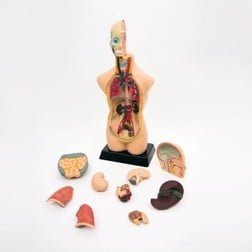Half sized, 11 piece dissectible anatomical torso, consisting of realistically coloured and detailed body parts in the correct proportion and location.