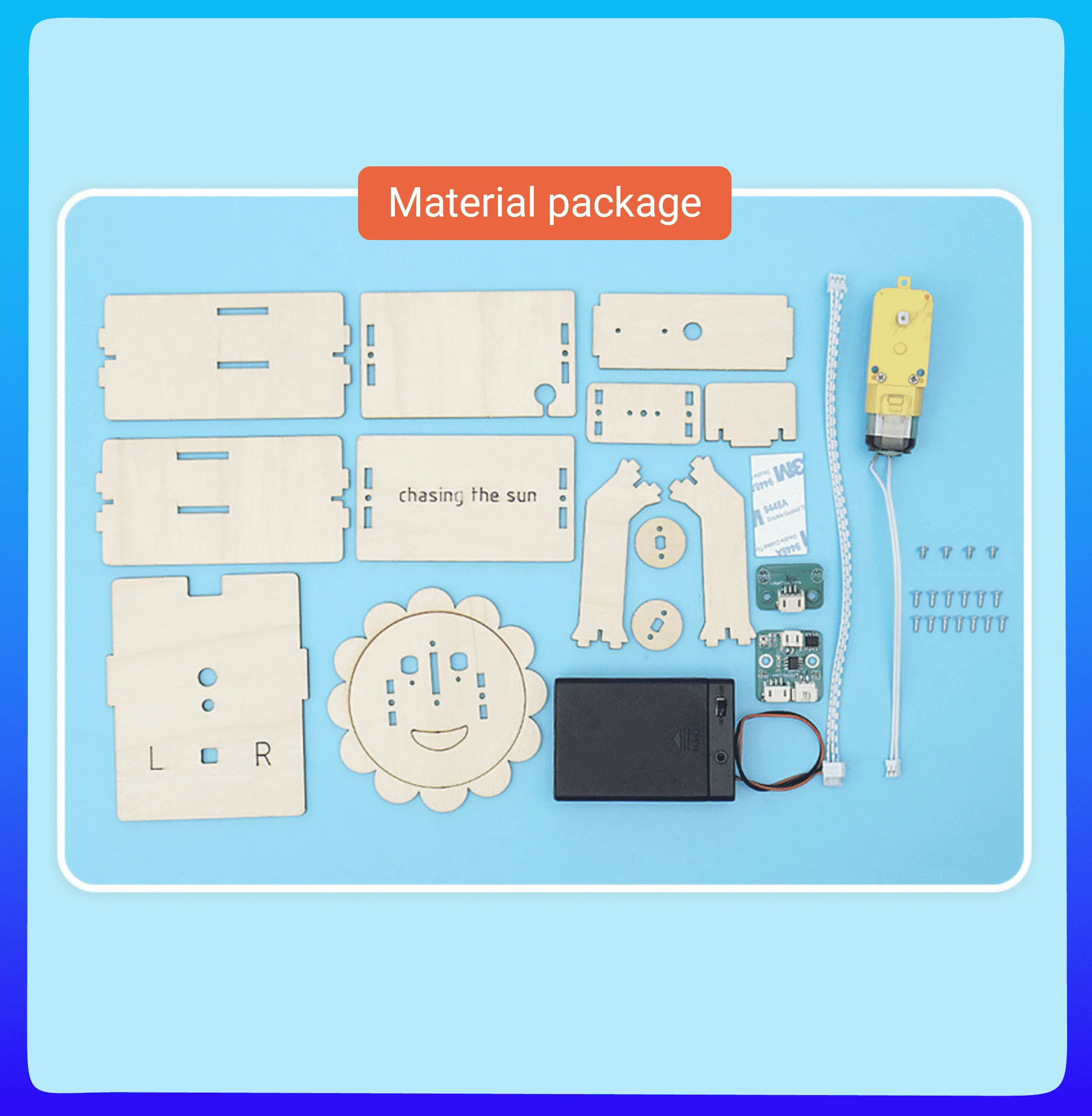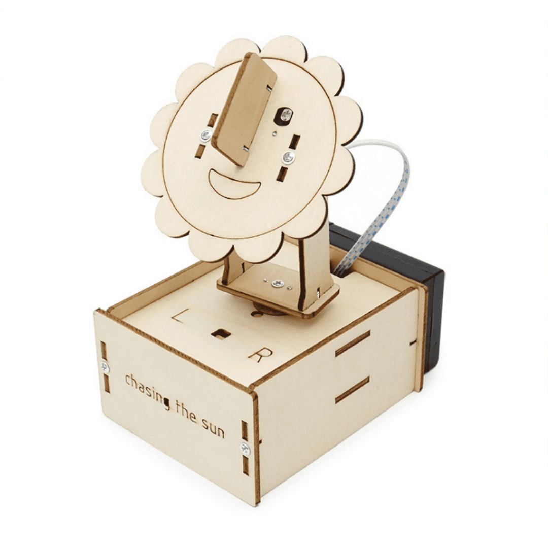 Chasing the Sun Build a flower that turns in the direction of the Sun and runs on battery. Batteries are not included. Assembly instructions are contained This product is not ready, you will manufacture it. There are all the materials needed to make your construction. Ages 12+