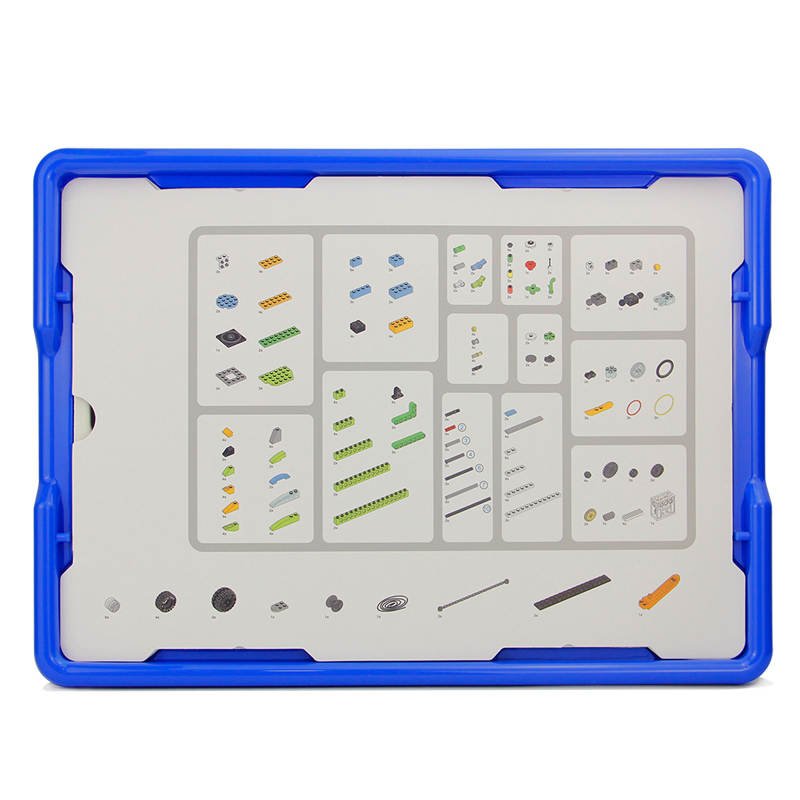 Introduction to Automation is delivered in a storage bin along with sorting trays, labels, a hub, a Medium Motor, Motion Sensor, a Tilt Sensor, and enough building elements for two students.