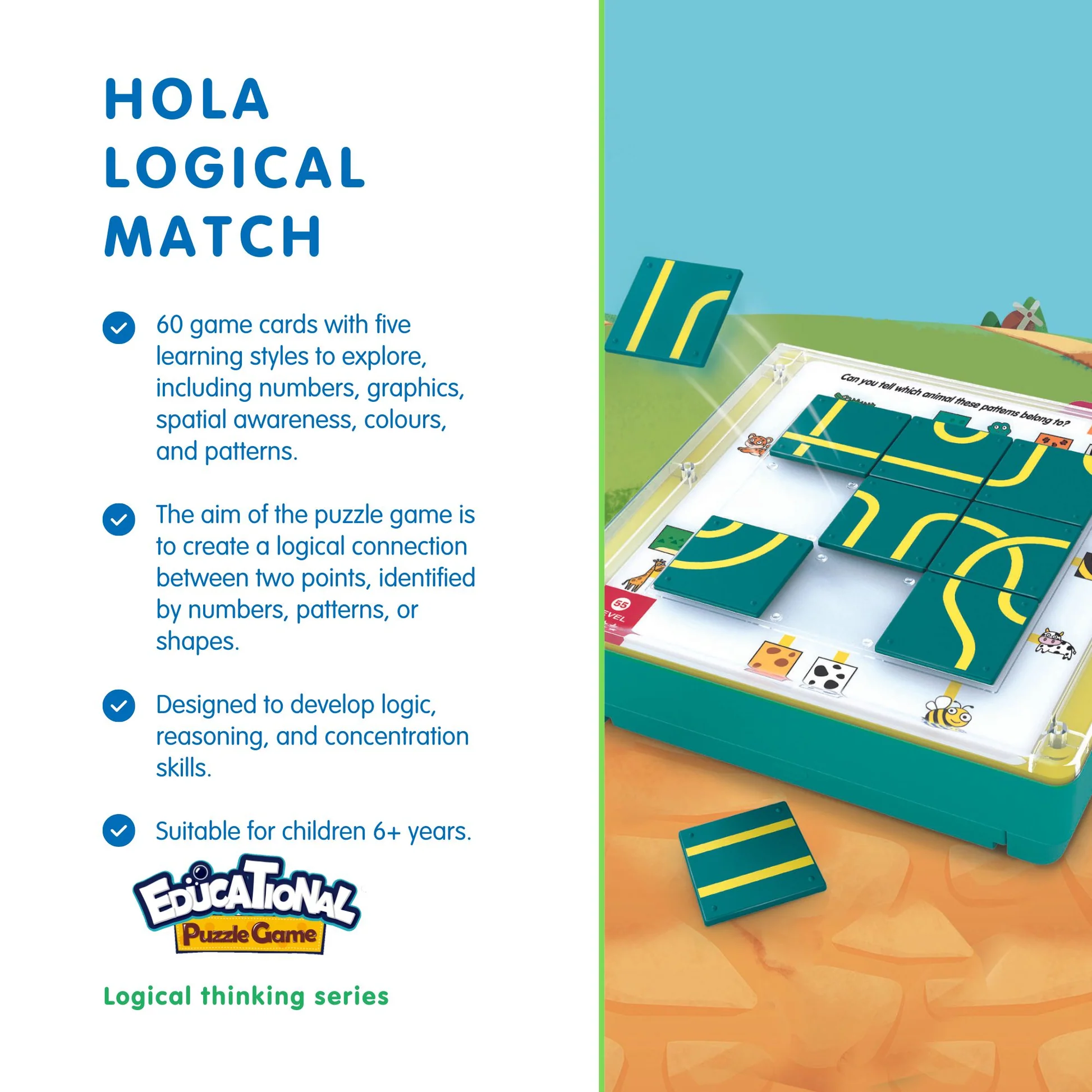 The Logical Match Puzzle is an absolute blast! It’s perfect for kids aged six and over – they’ll get a real challenge with each game card. Each game card  is made of nine pieces that create a logical connection between two points, identified by numbers or shapes. What’s more, there are five different styles  of game cards  to explore, including numbers, graphics, spatial awareness, colours and patterns! Plus, the puzzle helps develop important skills like planning, problem-solving and observation. This game encourages parent-child interaction while giving lots of fun learning opportunities. Suitable Age: 6+ years Product Size: 17.5 x 17.5 x 5 cm Package Size: 18 x 18 x 5.5 cm Battery: Not Required.