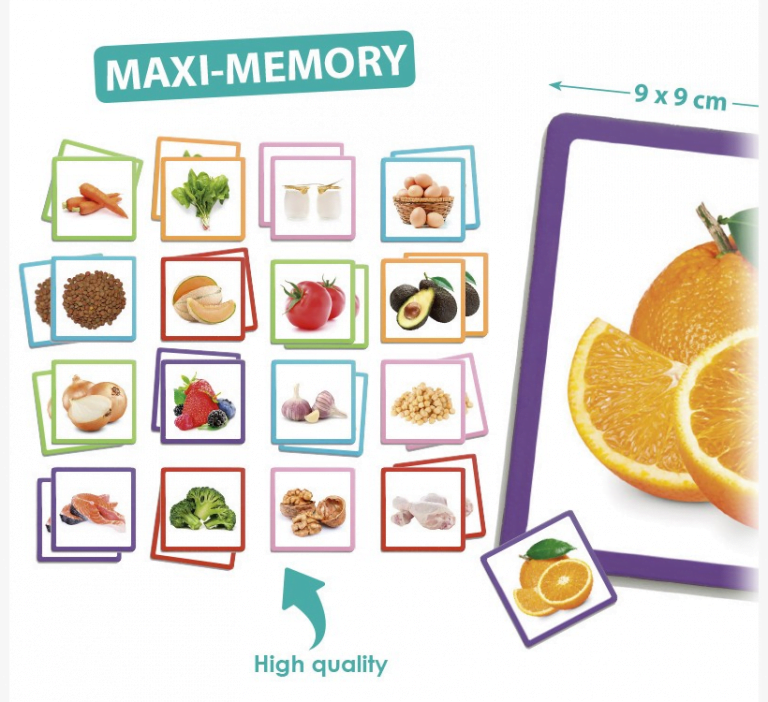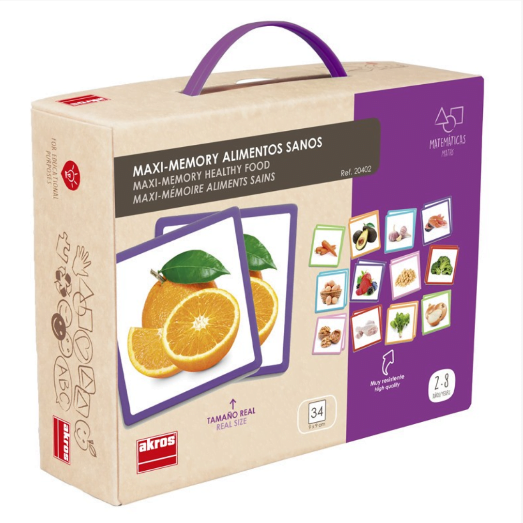 Maxi-Memory Healthy Food This game allows you to exercise memory with real images on large cards. It promotes the development of observation and concentration. Through the attention is improved visual and spatial memory. The wide variety of images helps to expand vocabulary. It also allows you to make phrases and establish associations between the images of the tabs according to the common characteristics.