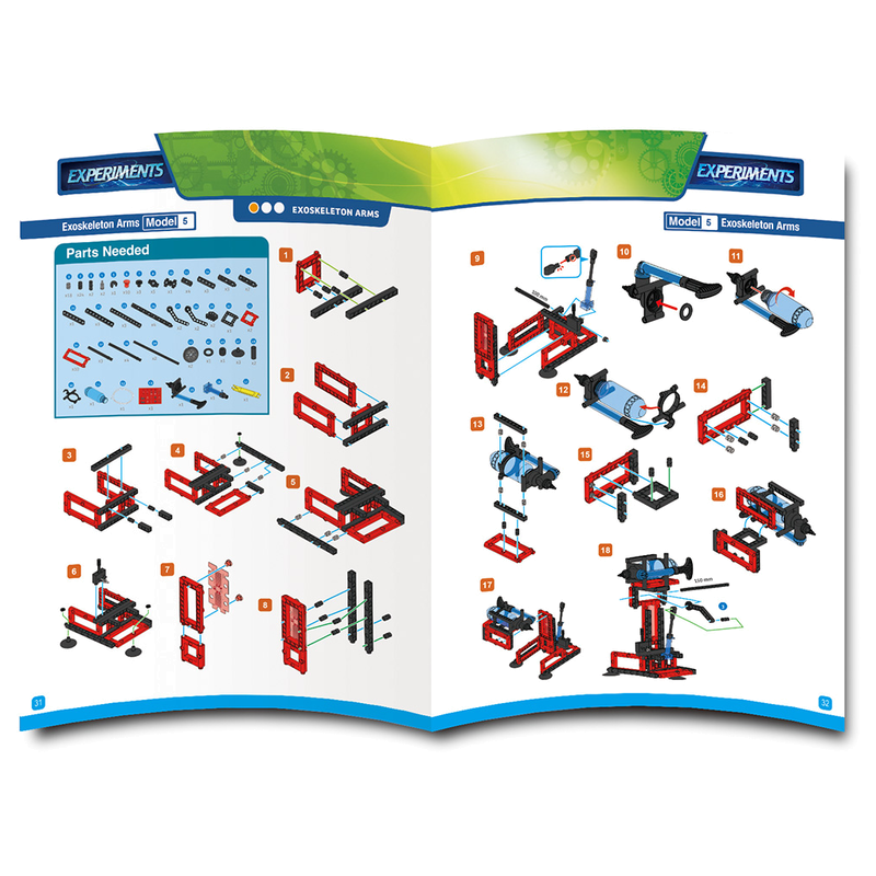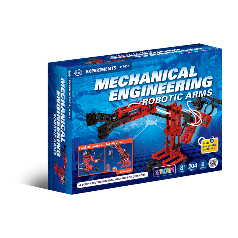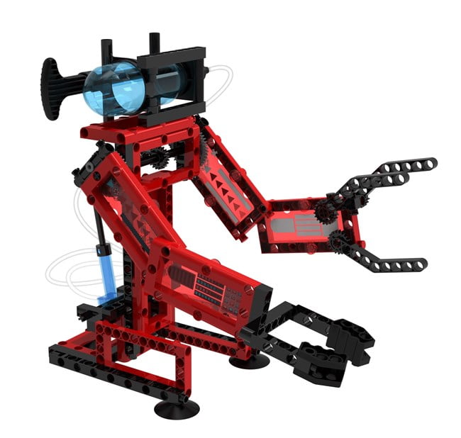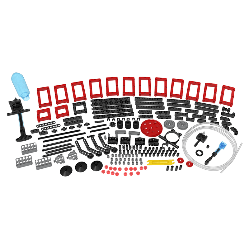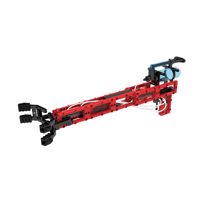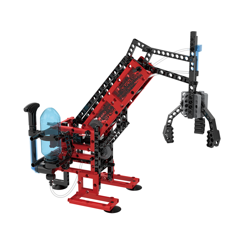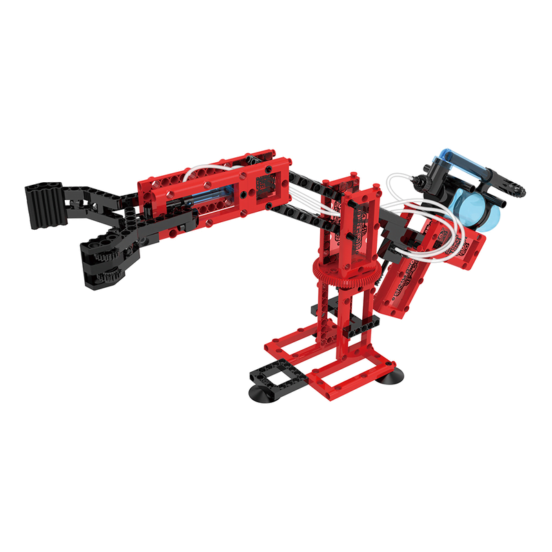 The Pneumatic Robotic Arm kit is all about advanced robotic movements powered by pneumatic compressed air. Robotic movements are awesome and to play and learn about how these functions for real is so cool. This set has a strong air pump to build up air pressure in the integrated air tank. Once you have pumped up the air pressure inside the tank, you have a reservoir of air you can use for several air-piston movements. With the pneumatic on/off switch, the air is lead into the air-piston that moves very powerfully in the direction it is being directed from the air valve switch. A set of realistic claw concepts makes it possible to build many different claw configurations.