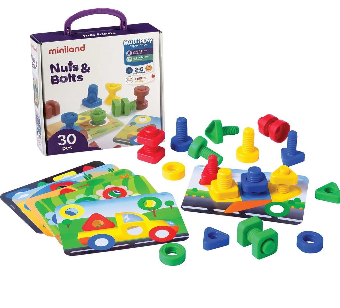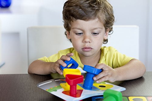 Large nuts and bolts, with 3 basic geometric shapes: Circle, Square and Triangle. This game enhances manual dexterity and hand-eye coordination when connecting and disconnecting. Durable plastic.