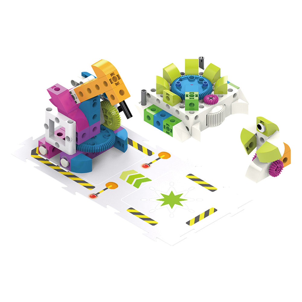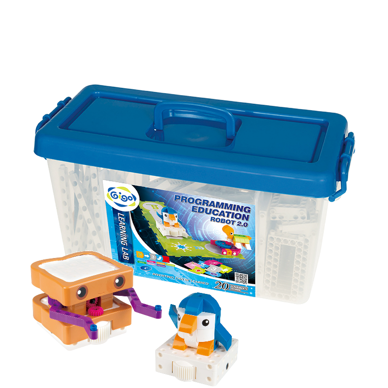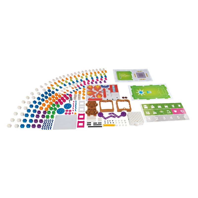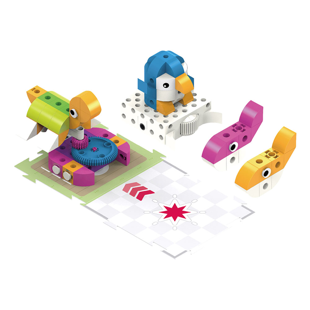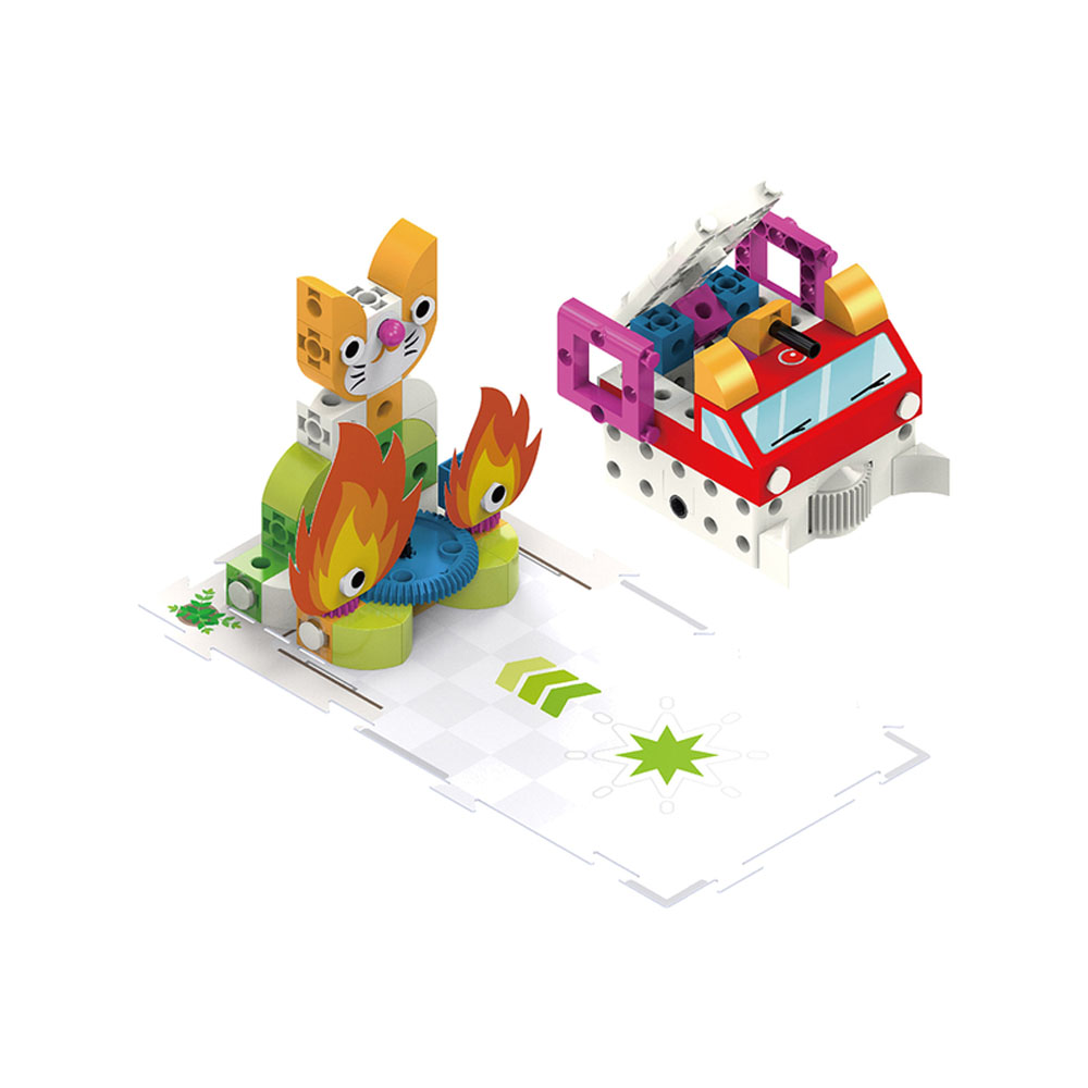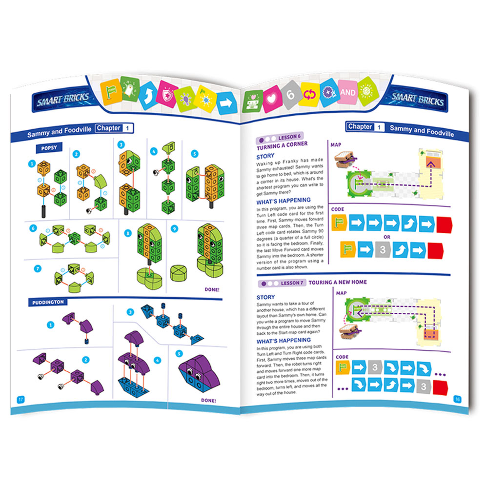 In addition to Sammy, there are five other stories, each with a series of model-building and coding challenges and lessons related to it: a mouse moves through a maze to find cheese; a penguin wanders around a zoo; a soccer player moves a ball into the goal; a fire truck puts out a fire, and a factory robot performs tasks in a factory scene. A full-color illustrated manual guides users through the coding lessons and the assembly of the different models.