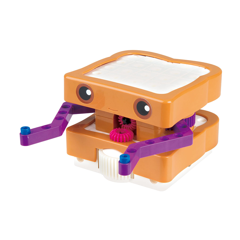 Meet Programming Education Robot. This cute little peanut butter and jelly sandwich is actually a robot that teaches coding principles and skills to children in grades K-2. You don’t need a tablet, smartphone, or computer to program this robot; programs are created by simply laying down a sequence of physical code cards. As the robot drives over the code cards, an OID optical scanner on the bottom of the robot reads the code cards one by one and loads the program. Next, place the robot on a grid made of map cards, and the robot runs the program. You can program the robot to move in different directions. Activate its output gear, light up its LED, play sounds, and respond to different function cards. The integrated output gear makes it possible to build simple robotic creations with arms or other moving parts that respond according to the program’s instructions.