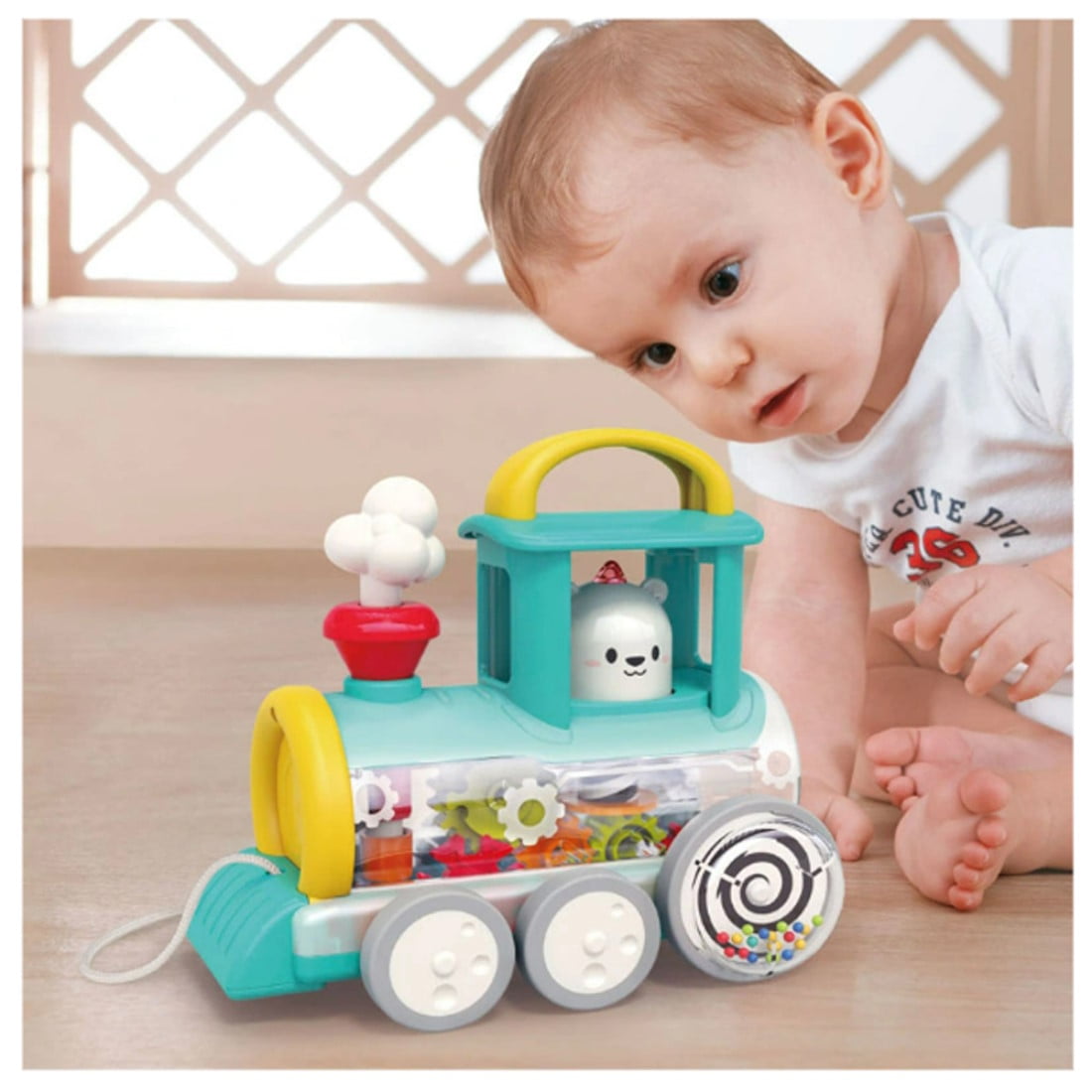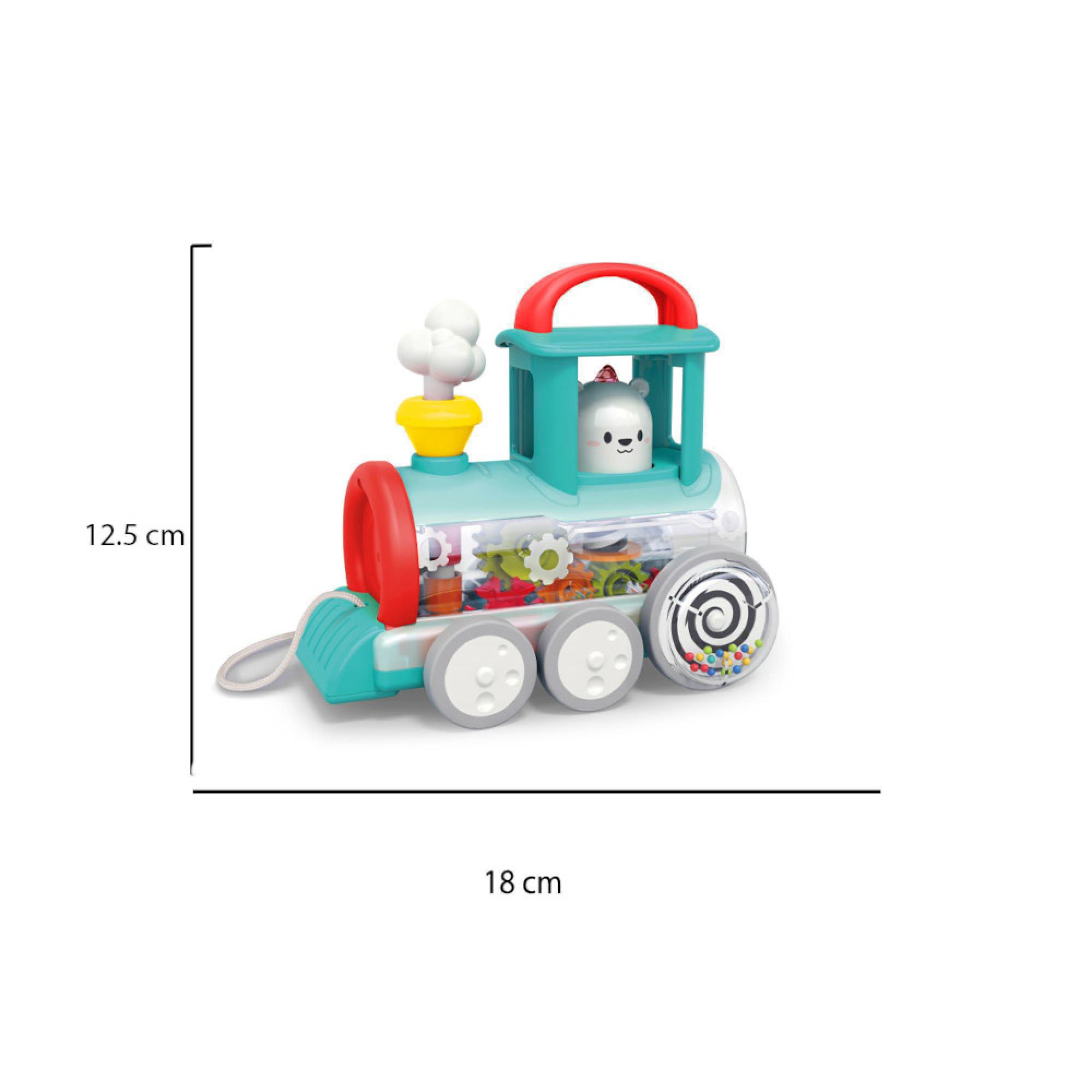 The driver of the train can turn round and round and the chimney on the locomotive will move up and down when the train goes forward or backward. Baby will be surprised by the principle of engineering.
