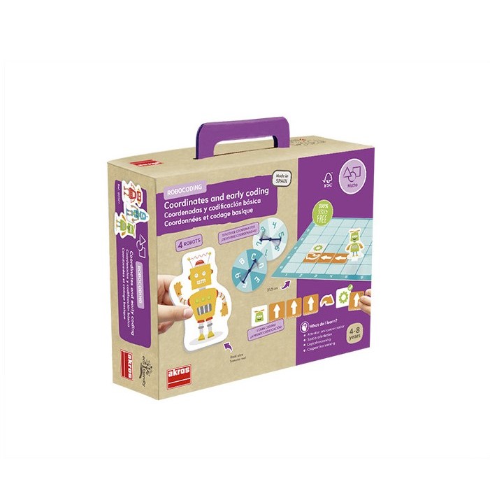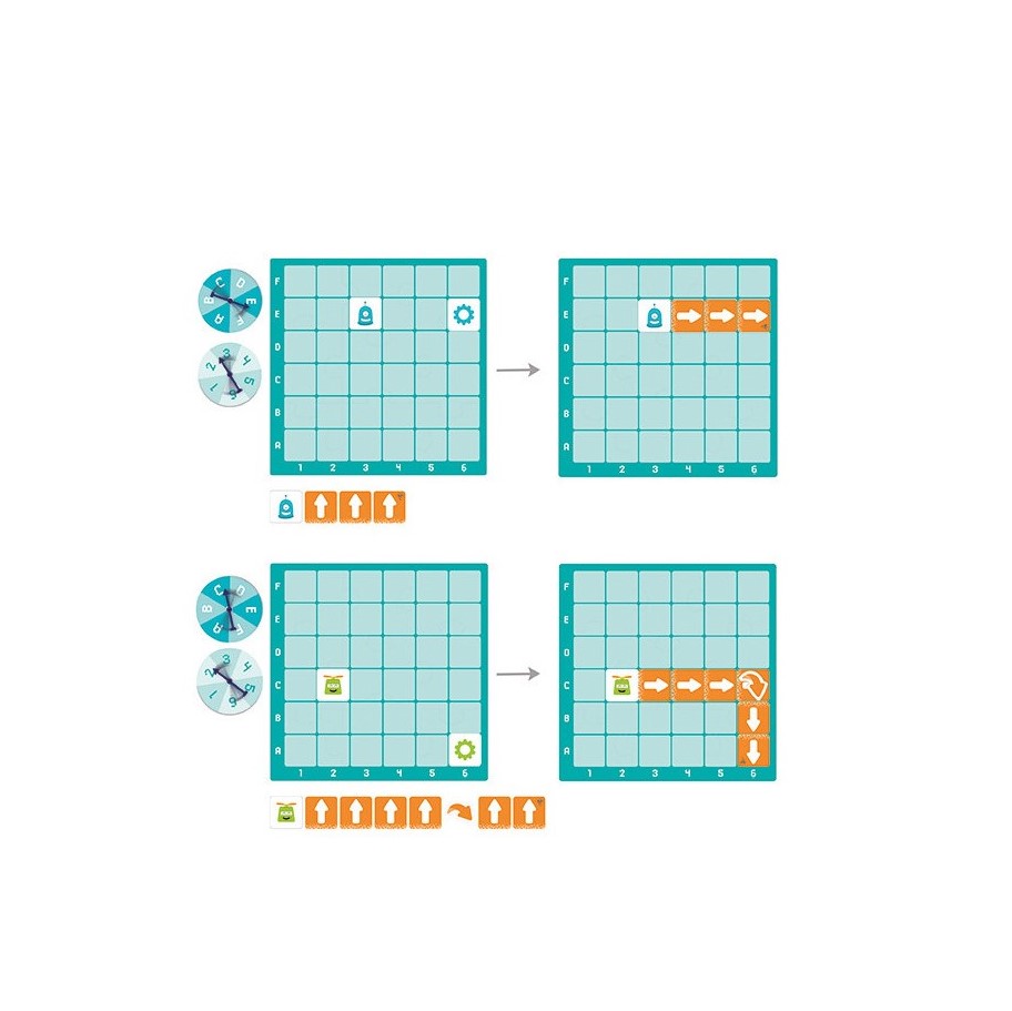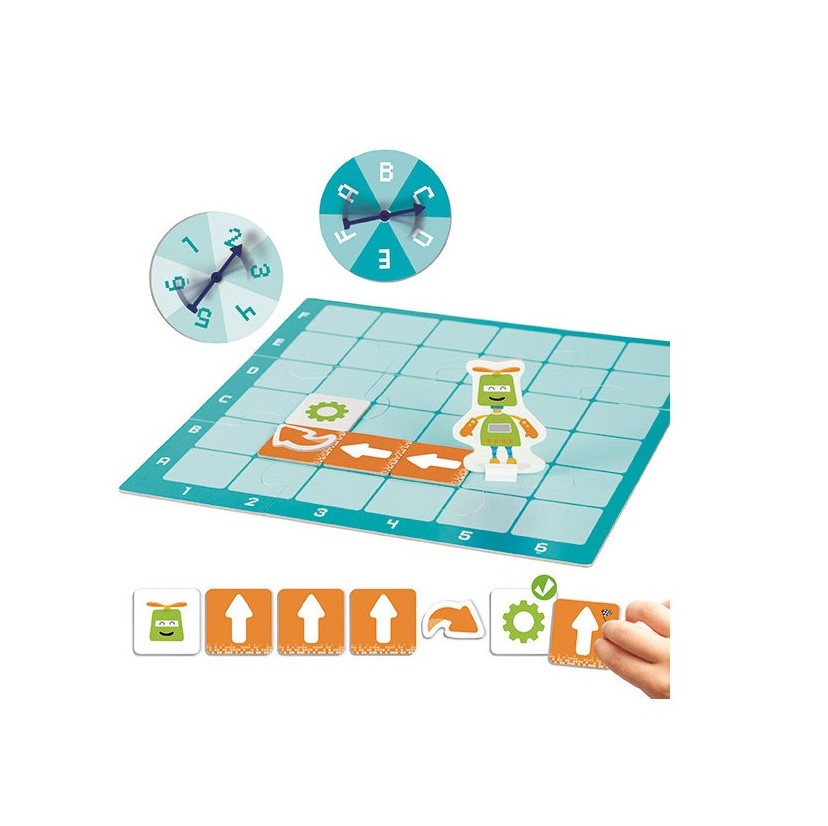 Coding without a computer? It’s the best way to start! Spin the roulette wheels and put the robots on the board. Learn about coordinates and first concepts of early coding.