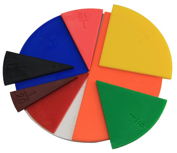 Includes pieces representing:1 1/2, 1/3, 1/4, 1/6 and 1/8.