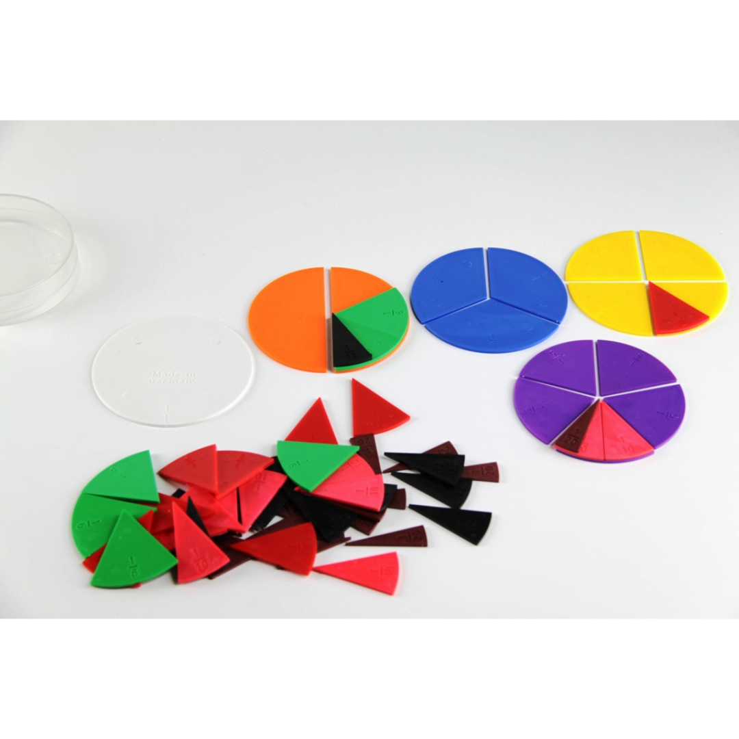 Round Fractions A marked set of plastic circles divided into fractional parts. Includes pieces representing:1 1/2, 1/3, 1/4, 1/6 and 1/8. The circles are 10 cm diameter in plastic box.