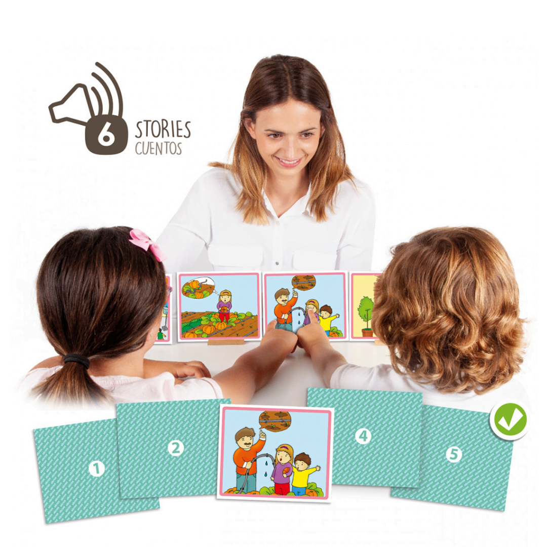 The set comprises on MP3 CD featuring 6 stories and 30 large illustrated cards with a self-correcting system.