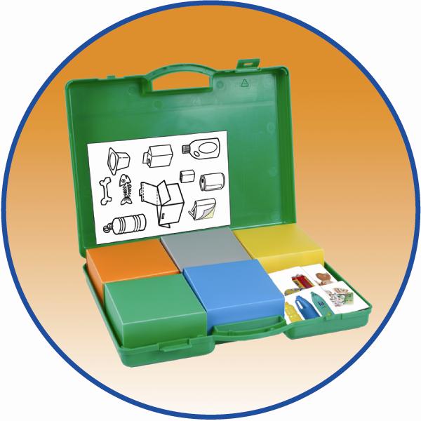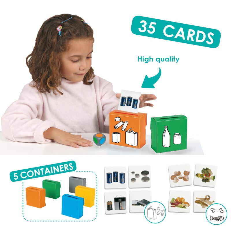 This product includes 5 small “recycling bins” (dimensions 100x100x50mm) in 5 different colors depending on the material to be recycled in them. In the “recycling bins” the children have to place each of the 35 different materials “garbage” in cards of dimensions 61x61mm. The cards are colored and illustrated. Suitable for age 3+ All in a plastic case measuring 320x220x60mm