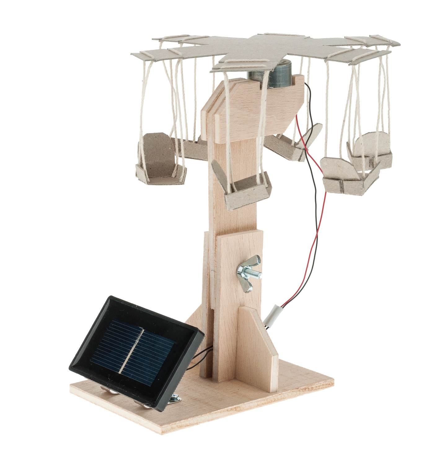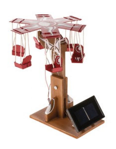 Solar-powered carousel with 6 seats. Material mix of cardboard and plywood. Work packing with solar motor RF 300 and a cast solar cell 0.5V.