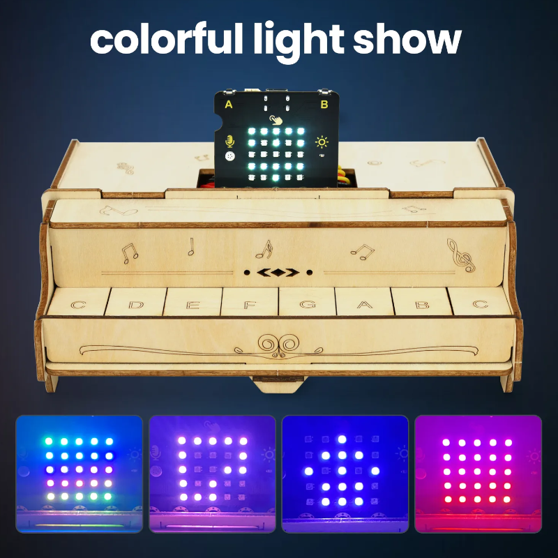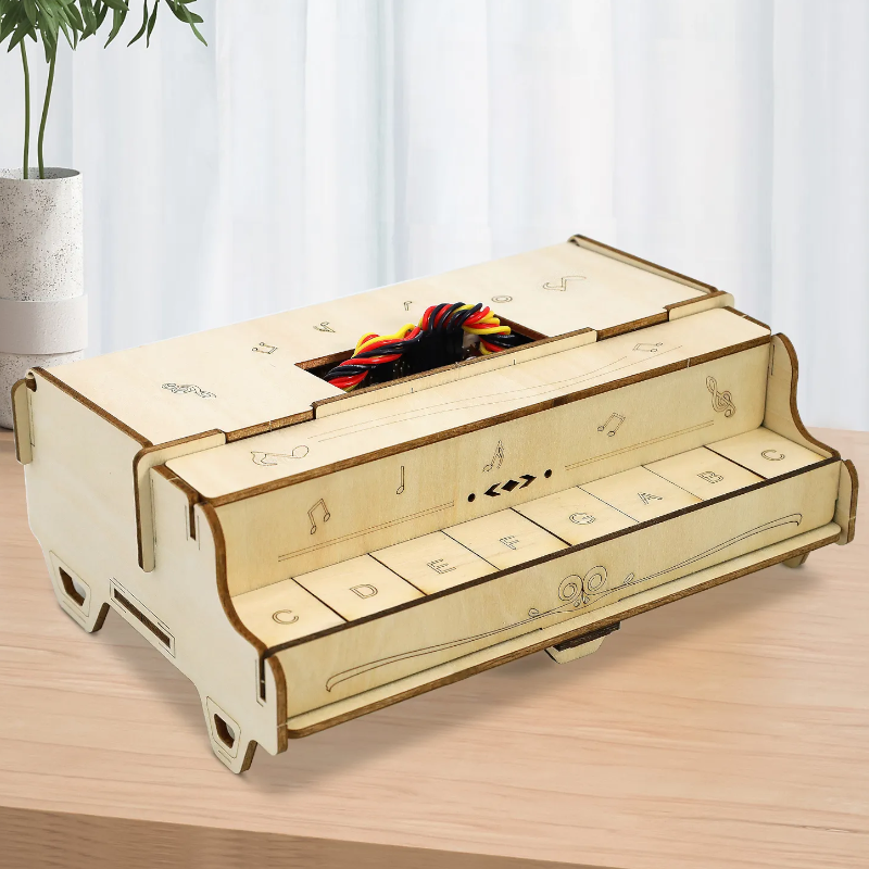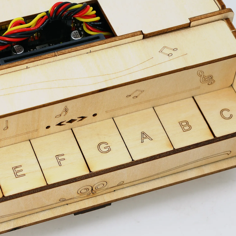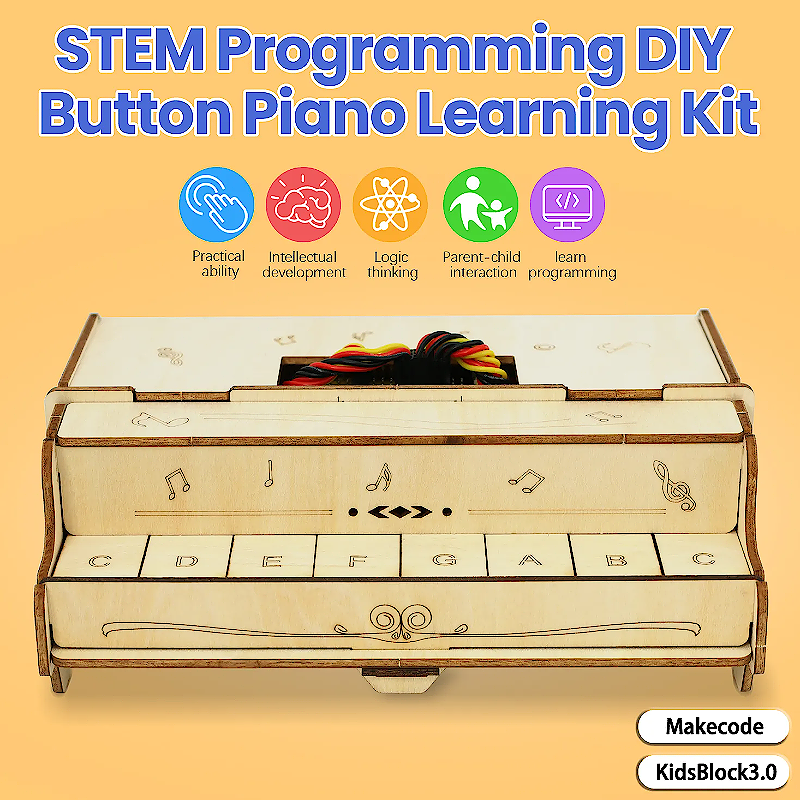 With basswood as a structural material, this unique piano learning kit integrates eight button modules as well as micro:bit mainboard or ESP-32 Easy Coding Board as its main control board. Besides, a built-in buzzer of the board enables it to play scales of do, re, mi, fa, so, la,si and Do . To write codes featuring more creation and interestingness, we design this kit which is compatible with multiple programming software, such as makcode and KidsBlock3.0. With this kit, you can not only master the basics of piano skills, but also enjoys an excellent opportunity to learn programming, which largely stimulate your creativity and talent. Wish you a wonderful experience with enchanting music and a perfect combination of learning and entertainment!