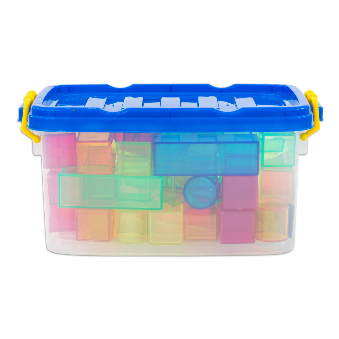 Of the 50 transparent building blocks, there are 6 different shapes in 5 colors. These building blocks open up many different play options for children. This promotes imagination, logical thinking and fine motor skills. The building blocks are also great for