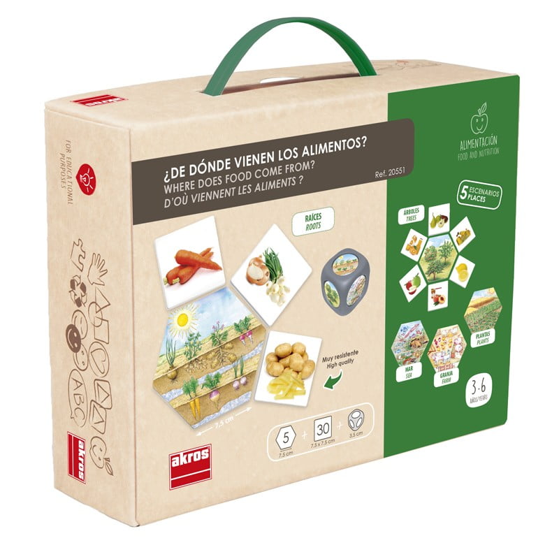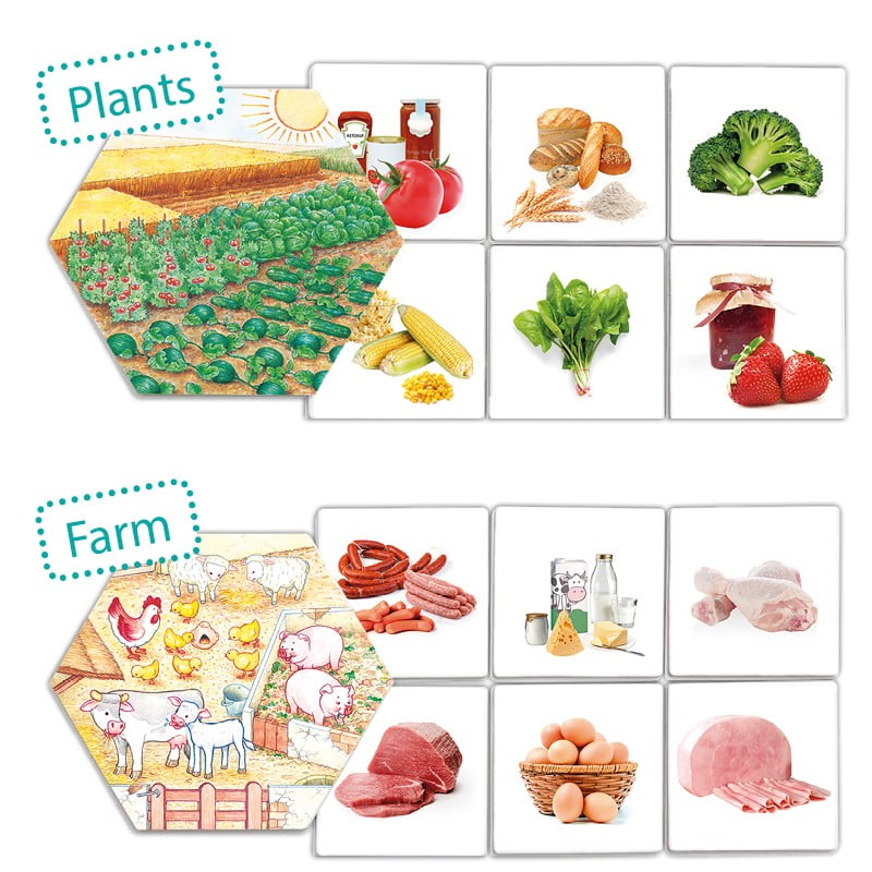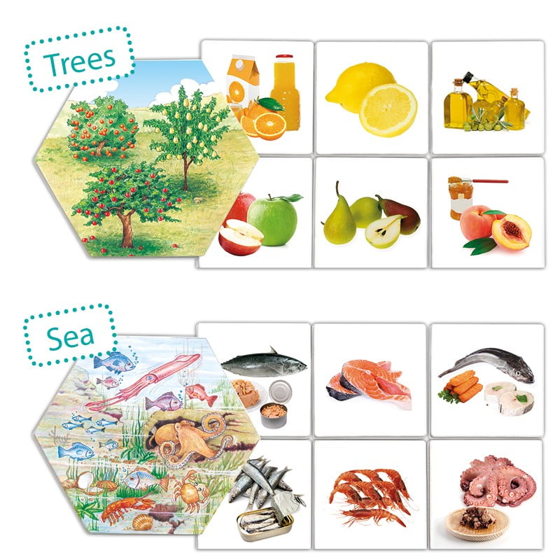 A game for learning the categorisation of food depending on their origin, i.e. from fruits/plants, roots of plants/shrubs, fruit trees, from the world of the sea, and from animals.