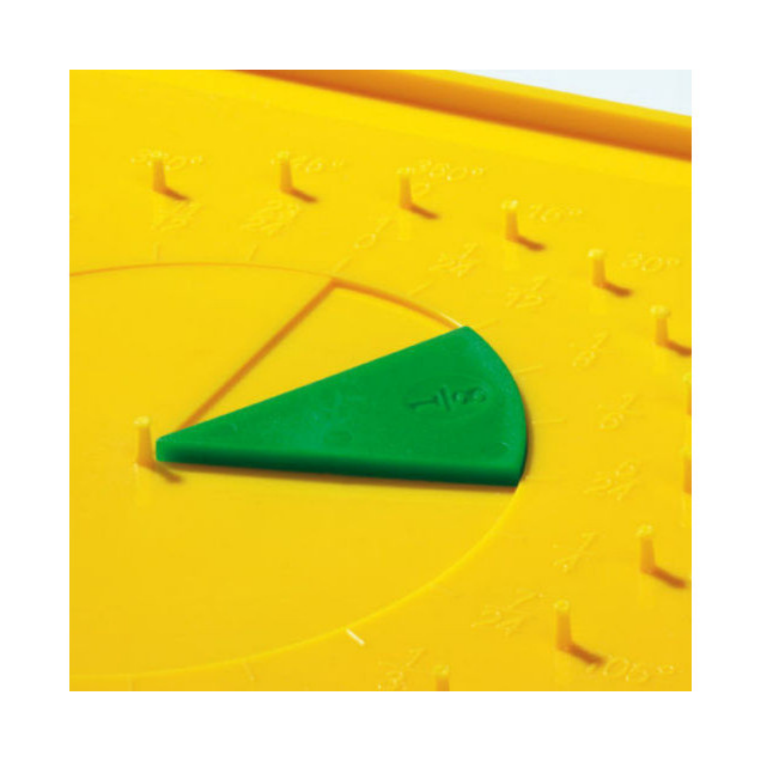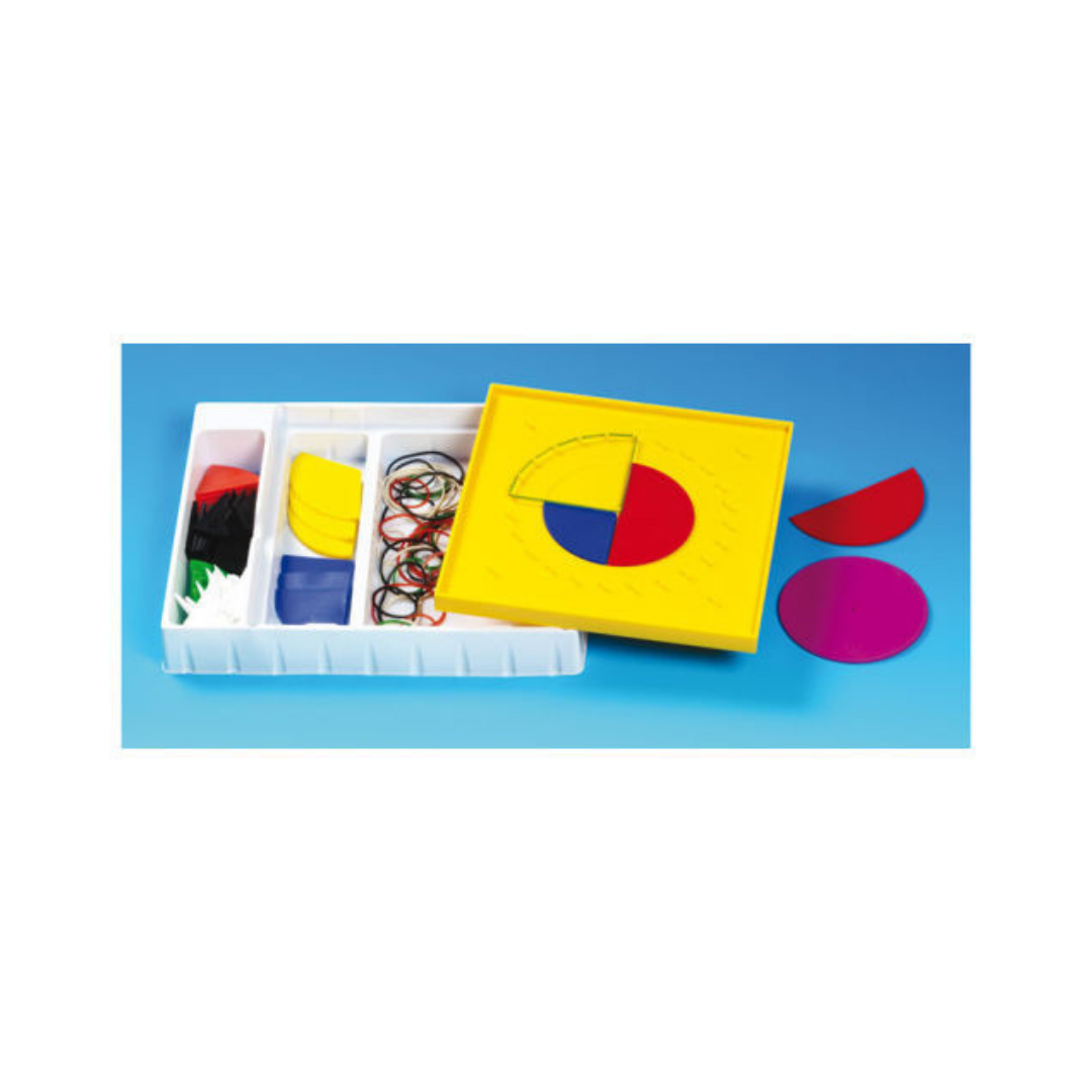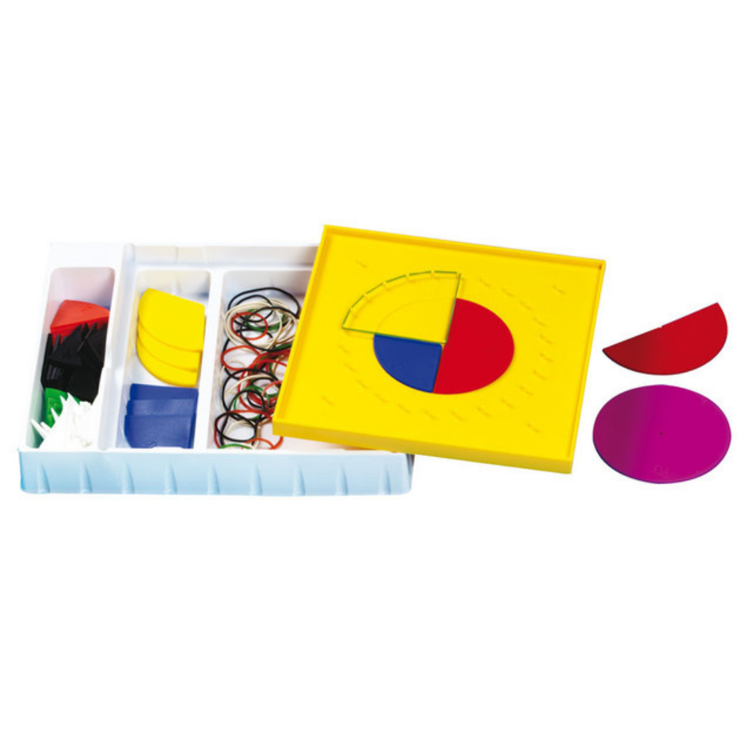 With this work set for calculating fractions and for geometry, many different exercise options are possible for your students. The fraction segment and rubber rings are housed in a practical plastic box, with the geometry and fraction arithmetic board serving as the lid. Everything is always sorted and neatly stored.