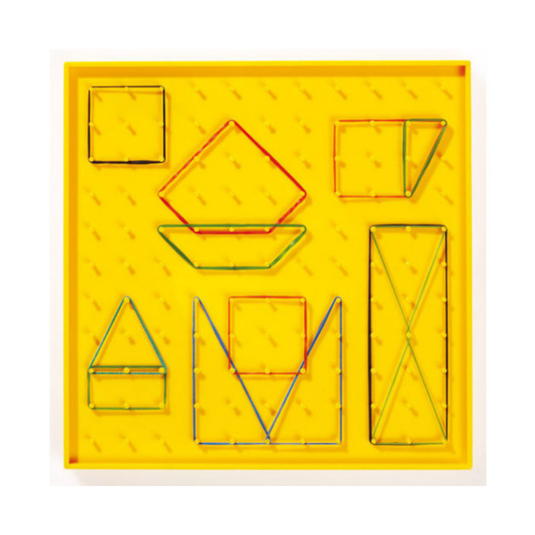 There are 121 (11 x 11) pegs on the back. Your students will use rubber bands to outline all flat surfaces. You compare perimeters, areas and angles. Symmetries are discovered. Degrees are marked around the circle.