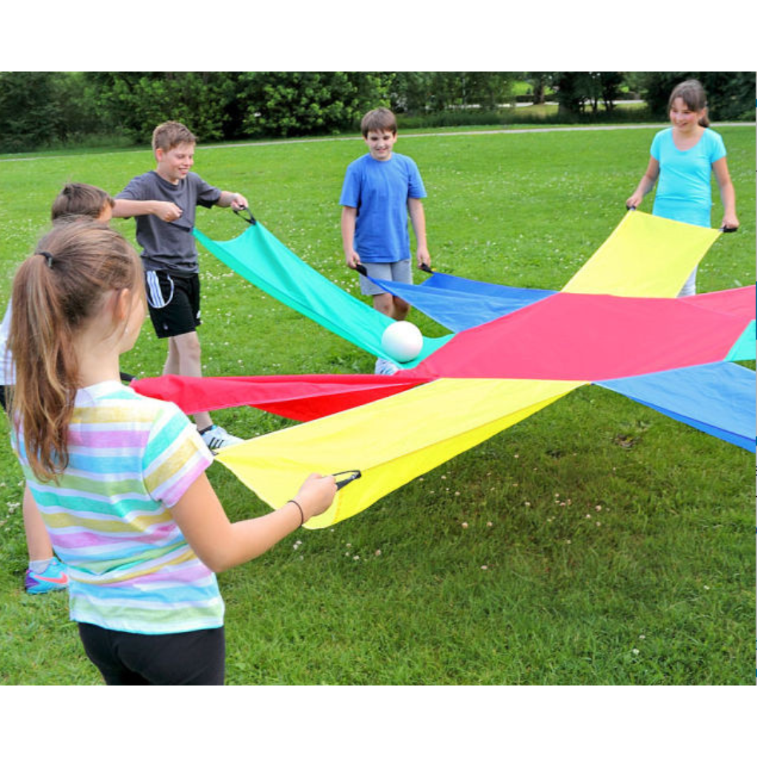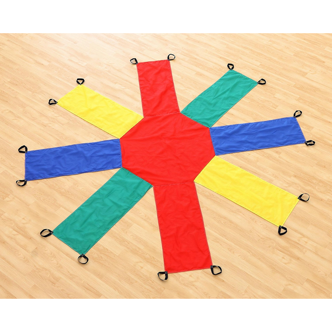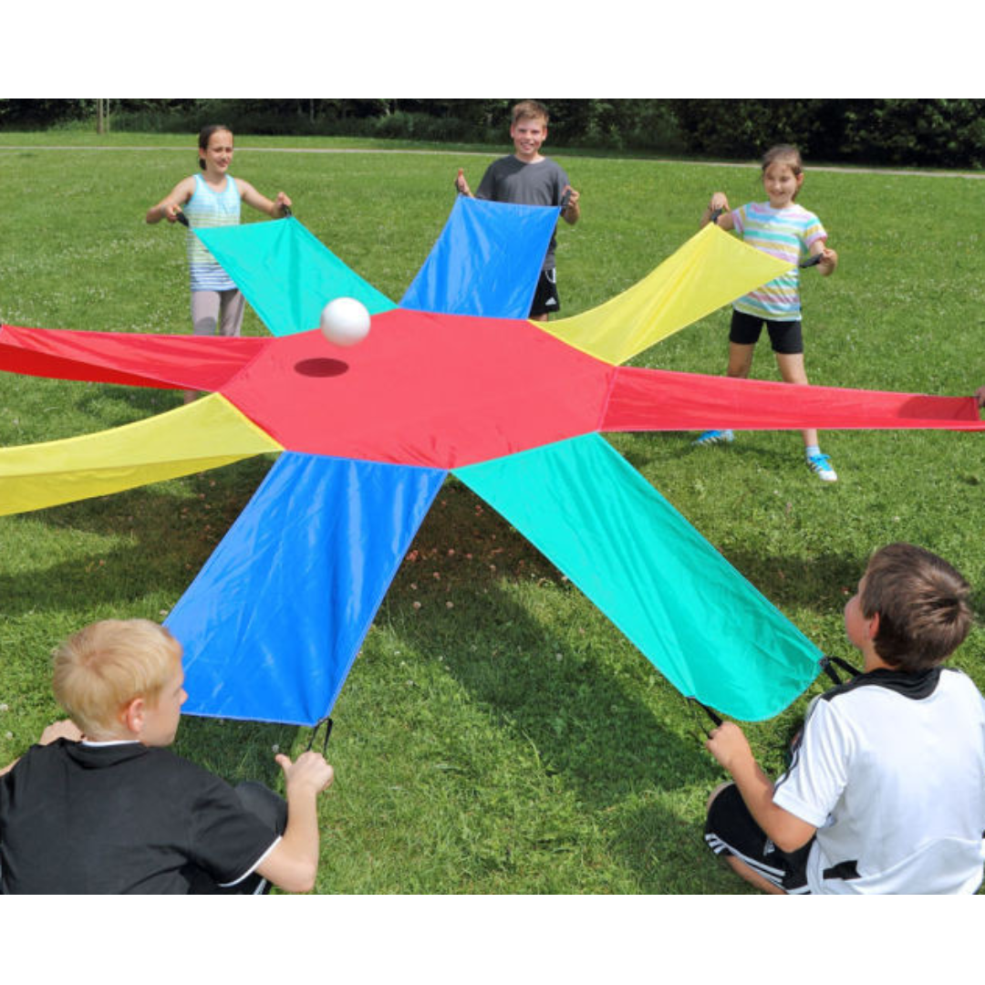 Το Αλεξίπτωτο Ηλιοτρόπιο προσθέτει ποικιλία στις ομαδικές δραστηριότητες. Τα παιδιά θα αναπτύξουν τις κινητικές τους δεξιότητες καθώς κυλούν την μπάλα κατά μήκος κάθε βραχίονα. Μια διασκεδαστική δραστηριότητα η οποία απαιτεί καλή συνεργασία από τα μέλη της ομάδας και αυτοσυγκέντρωση. Ιδανικό παιχνίδι στην αρχή της σχολικής χρονιάς στα πλαίσια της γνωριμίας των παιδιών και της ανάπτυξης επικοινωνιακών δεξιοτήτων. Κατασκευασμένο από 100% νάιλον. Αποθηκεύεται και μεταφέρεται εύκολα στη δική του τσάντα. Διαθέτει 2 ισχυρές λαβές σε κάθε βραχίονα που επιτρέπουν να παίξουν έως 16 παιδιά . Διάμετρος 3.5 m.