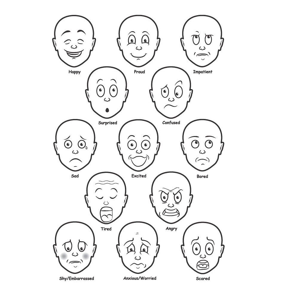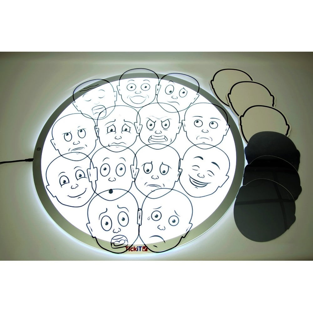 Στο σετ περιλαμβάνονται 13 πρόσωπα με διαφορετικές εκφράσεις συναισθημάτων. Αυτά μπορούν να τα χειριστούν τα παιδιά – τοποθετημένα σε τραπέζι, παράθυρο ή φωτιστικό πάνελ. Μια αφίσα Α3 αυτών των εκφράσεων περιλαμβάνει ένα “κλειδί” για αυτό που δείχνουν.
