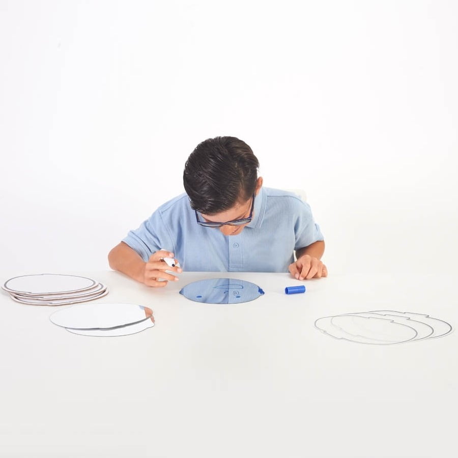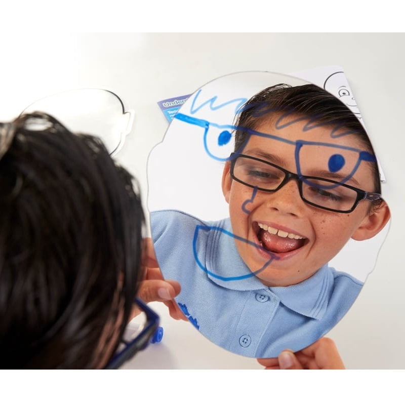 Περιλαμβάνονται επίσης τρεις λευκές άδειες επιφάνειες σε σχήμα προσώπου για χρήση με μαρκαδόρους στεγνής διαγραφής, τρία διάφανα φύλλα οξικής κυτταρίνης (acetate) σε σχήμα προσώπου και τρεις καθρέφτες σε σχήμα προσώπου για την παρατήρηση της αυτοέκφρασης.
