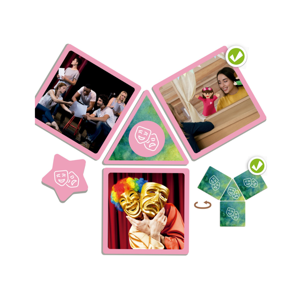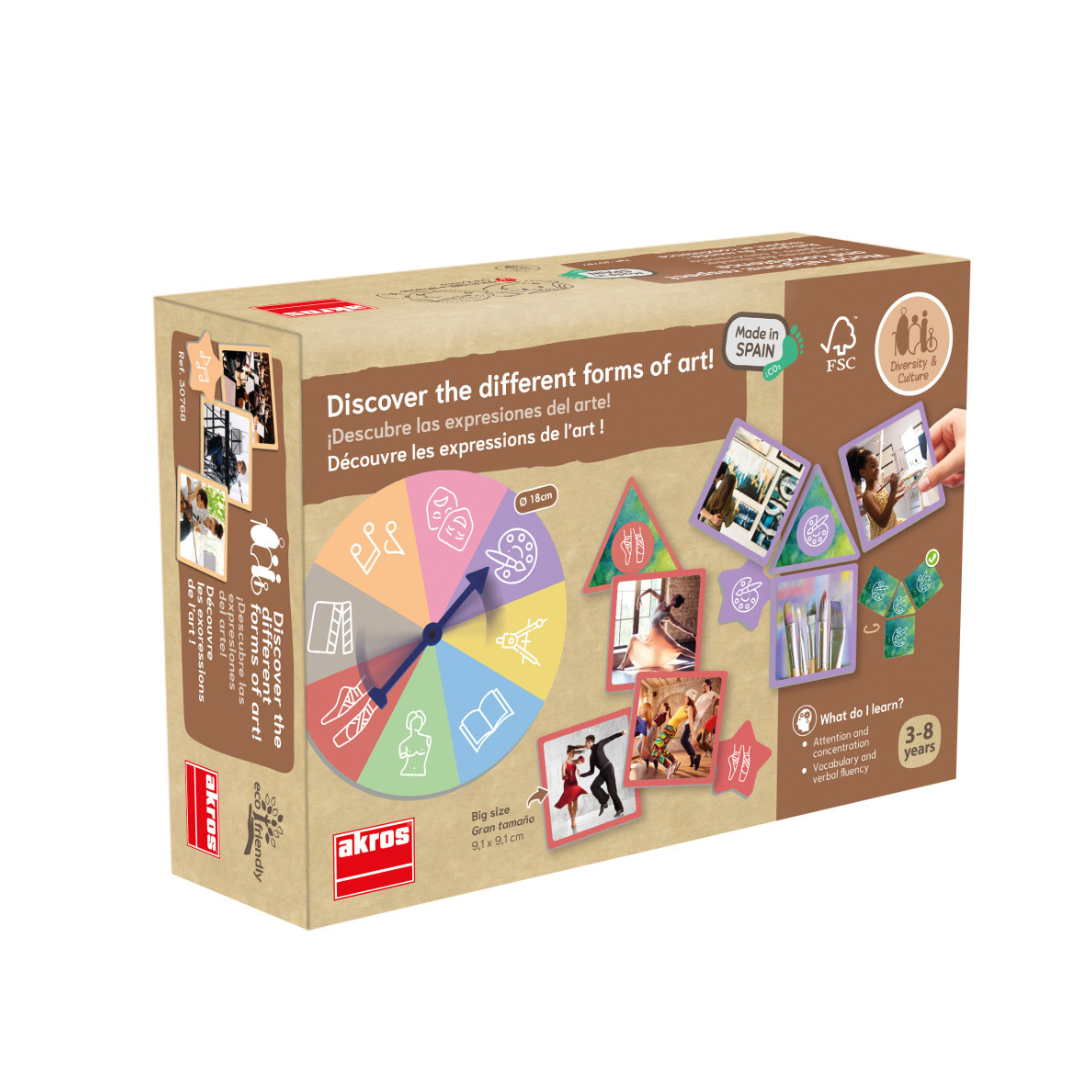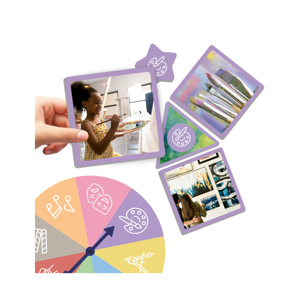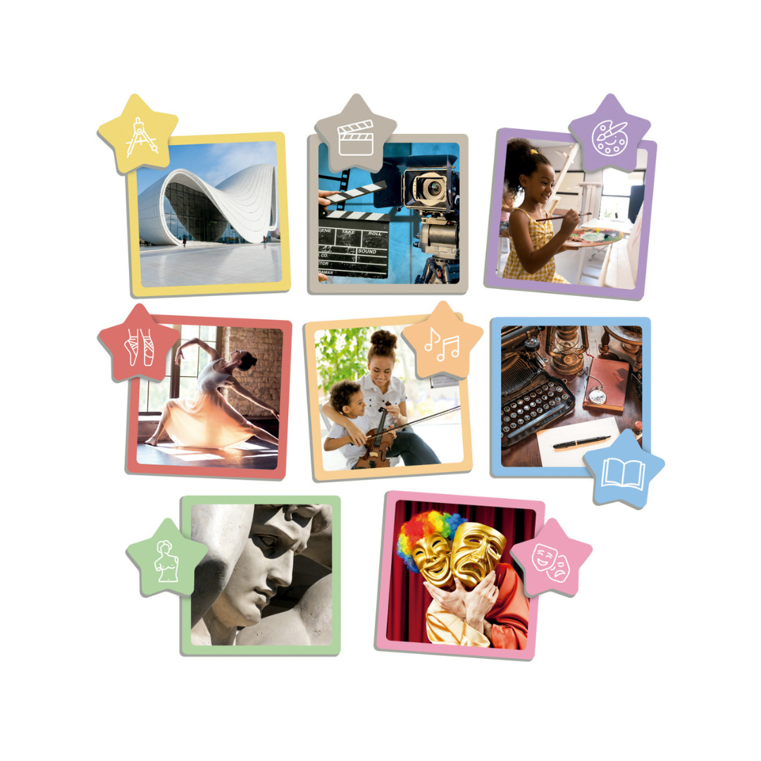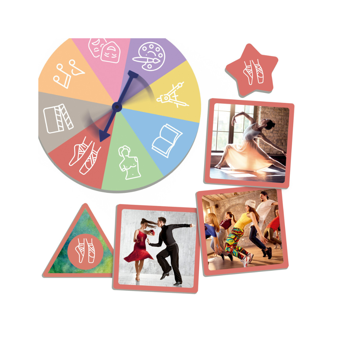 Πρωτότυπο παιχνίδι συσχέτισης χρησιμοποιώντας πραγματικές εικόνες για να ανακαλύψετε την τέχνη στις διάφορες μορφές της: ζωγραφική, γλυπτική, αρχιτεκτονική, λογοτεχνία, κινηματογράφο, θέατρο, μουσική και χορό. Περιστρέψτε τον τροχό και ανακαλύψτε την αγαπημένη σας μορφή τέχνης! Μεγάλες αναστρέψιμες κάρτες με σύστημα αυτοδιόρθωσης.