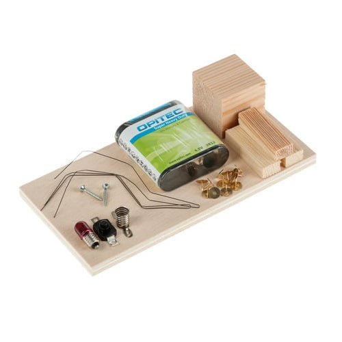 Απλό Ηλεκτρικό Κύκλωμα Μοντέλο ενός ηλεκτρικού κυκλώματος με σκοπό ένα φως να αναβοσβήνει. Περιέχει όλα τα απαραίτητα εξαρτήματα όπως τα ξύλινα υλικά για την κατασκευή, λαμπάκι, διακόπτη, καλώδιο, πινέζες . Τα μόνα εργαλεία που απαιτούνται είναι ένα κοφτάκι, ένα κατσαβίδι και κόλλα. Περιλαμβάνει μπαταρία 4.5V Το προϊόν αυτό δεν είναι έτοιμο, θα το κατασκευάσετε εσείς. Υπάρχουν όλα τα υλικά που χρειάζονται για να φτιάξετε την κατασκευή σας. Η φωταγραφία είναι ενδεικτική του προϊόντος