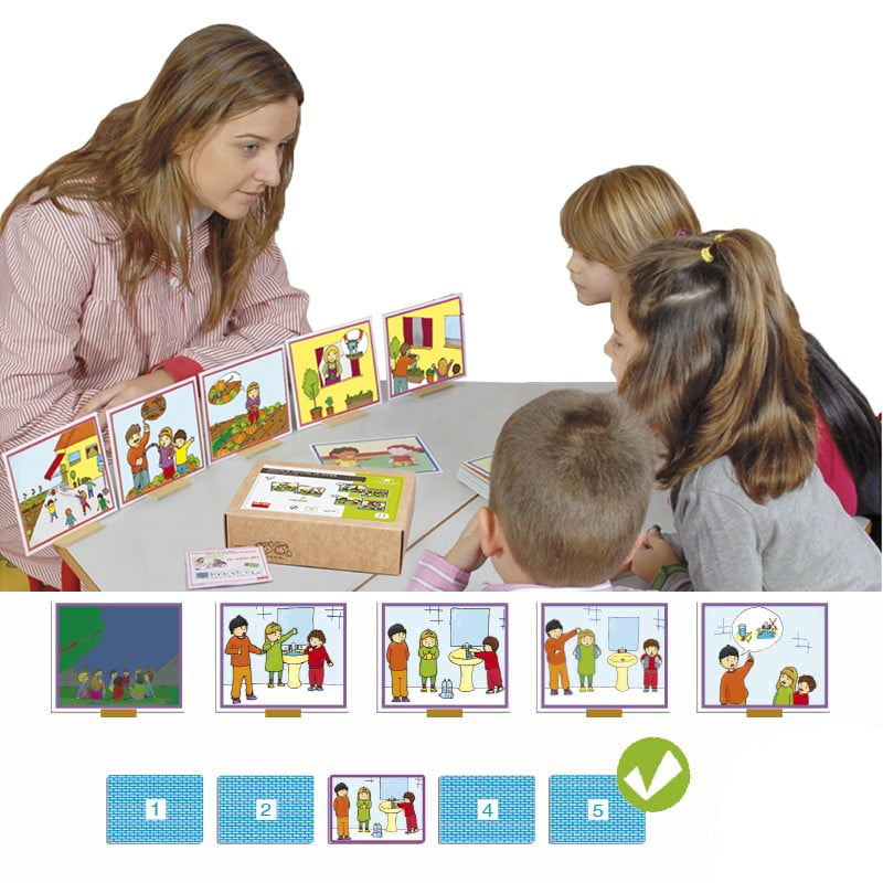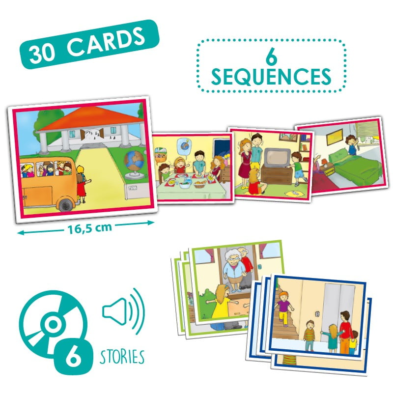 Κάθε ιστορία περιλαμβάνει 5 έγχρωμες και εικονογραφημένες κάρτες οι οποίες πρέπει να τοποθετηθούν στη σωστή σειρά, ακολουθώντας την ιστορία που ακούτε από το CD.
