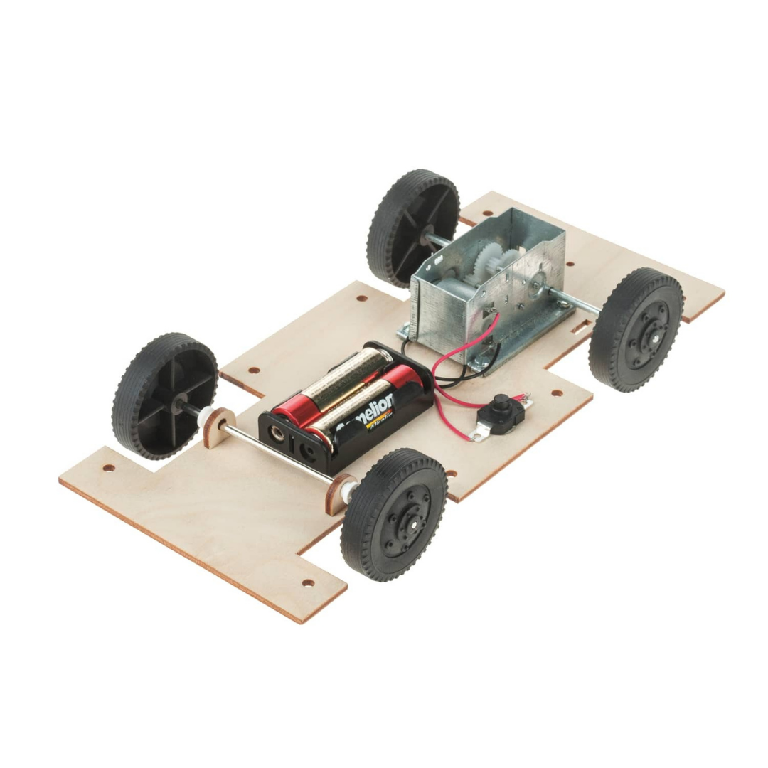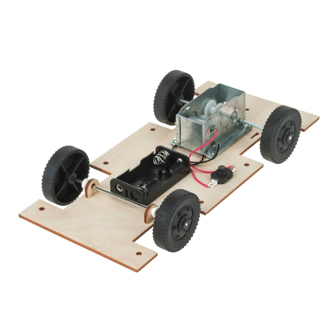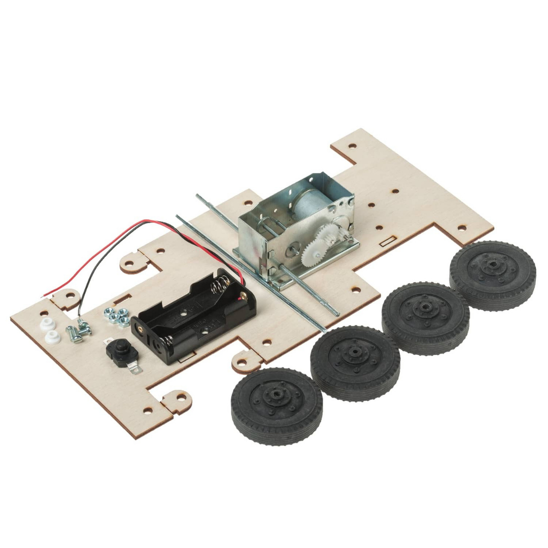 Κατασκευή αυτοκίνητου με προ-κομμένη ξύλινη βάση, ηλεκτροκινητήρα, πλαστικές ρόδες, και θήκη μπαταρίας με διακόπτη.