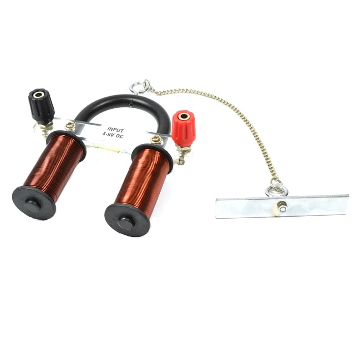 Ηλεκτρομαγνήτης Πεταλοειδής 4-6V Χρησιμοποιείται για την επίδειξη των δυνάμεων που ασκούν οι ηλεκτρομαγνήτες σε σιδηρομαγνητικά υλικά. Αποτελείται από 2 απλούς ηλεκτρομαγνήτες προσαρμοσμένους σε κοινό πυρήνα σχήματος U. Όταν το ηλεκτρικό ρεύμα διαρέει και τα δύο πηνία χάλκινου σύρματος, παράγει ένα μαγνητικό πεδίο. Πειραματιστείτε και προσπαθήστε να βρείτε το όριο φορτίου που μπορεί να σηκώσει αυτός ο ηλεκτρομαγνήτης σχήματος U, χρησιμοποιώντας τον προσαρτημένο οπλισμό. Ιδανικός για επιδείξεις φυσικής που διδάσκουν τους μαθητές για τον ηλεκτρισμό και τον μαγνητισμό. Αποτελείται από μαλακό σίδερο U διαμέτρου 9mm, δύο πηνία σύρματος χαλκού διαμέτρου 0.7 mm (270 στροφές). Δύο μπόρνες 4mm για σύνδεση σε πηγή ρεύματος 4-6 volt DC. Διαστάσεις: 4.75″ x 4″ x 1.75″ (12 x 10 x 4.5cm)