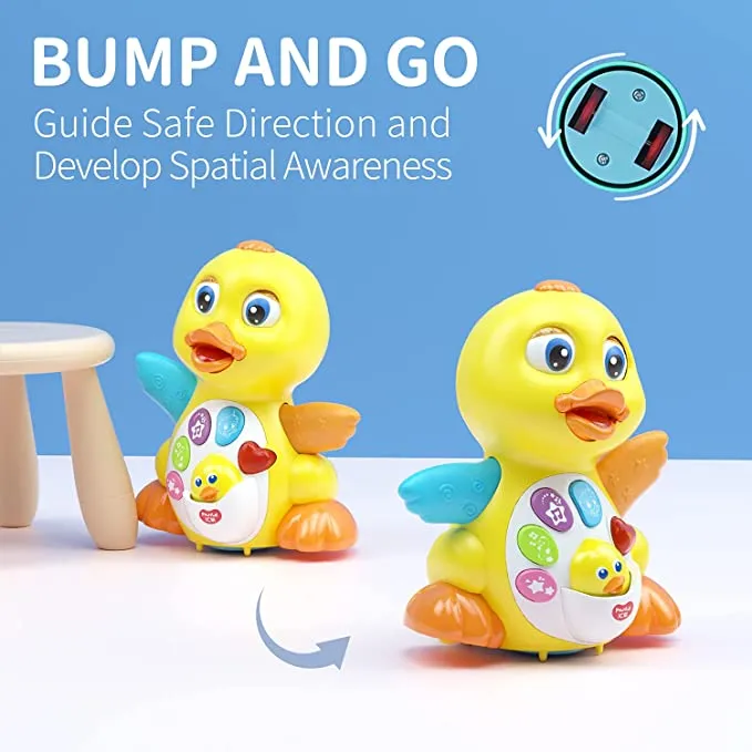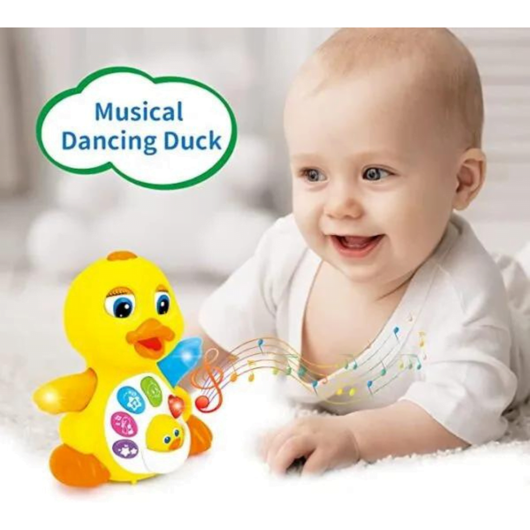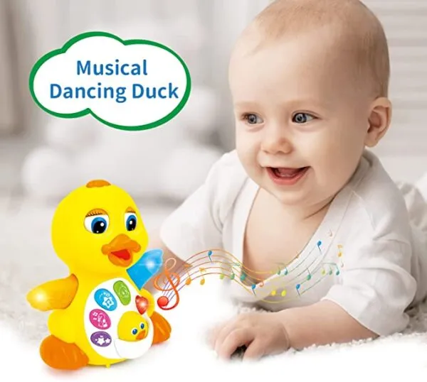 Διασκεδάστε και χορέψτε με την πάπια που τραγουδάει, χορεύει και φωτίζει! Με έξι διαφορετικά κουμπιά που βρίσκονται στο στήθος της πάπιας που παίζουν μελωδίες, φωνούλες και φώτα που αναβοσβήνουν, είναι τόσο διασκεδαστικό για το μικρό παιδί σας να παίξει! Από τα μάτια της πάπιας, μέχρι τα φτερά και το σώμα της, είναι εξαιρετικά οπτικά διεγερτικό για το μωρό σας με ένα σωρό χρώματα και φώτα. Το μικρό σας θα λατρέψει να κυνηγάει την πάπια καθώς πέφτει σε εμπόδια και στρίβει για να τα αποφύγει και φτερουγίζει τα φτερά της.
