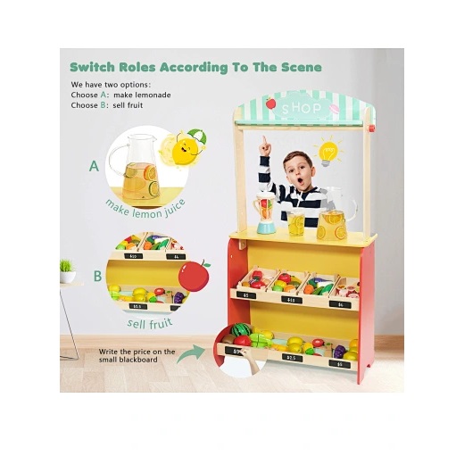 - Η μία πλευρά της σκηνής διαθέτει έναν πίνακα κιμωλίας για σχέδιο και γραφή, ενώ η άλλη πλευρά έχει ένα κατάστημα με φρούτα για παιχνίδι ρόλων.