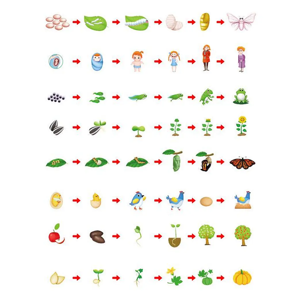 Αυτό το μαγνητικό παζλ επίδειξης κύκλων ζωής φυτών και ζώων περιλαμβάνει: