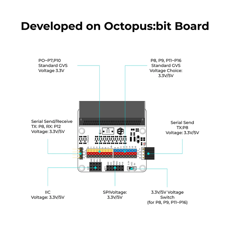 Το μεγαλύτερο χαρακτηριστικό του Octopus:bit είναι ότι μπορεί να αλλάξει ηλεκτρικό επίπεδο για ορισμένες θύρες GPIO, γεγονός που καθιστά διαθέσιμο το micro:bit για προσαρμογή σε αισθητήρες 5V.