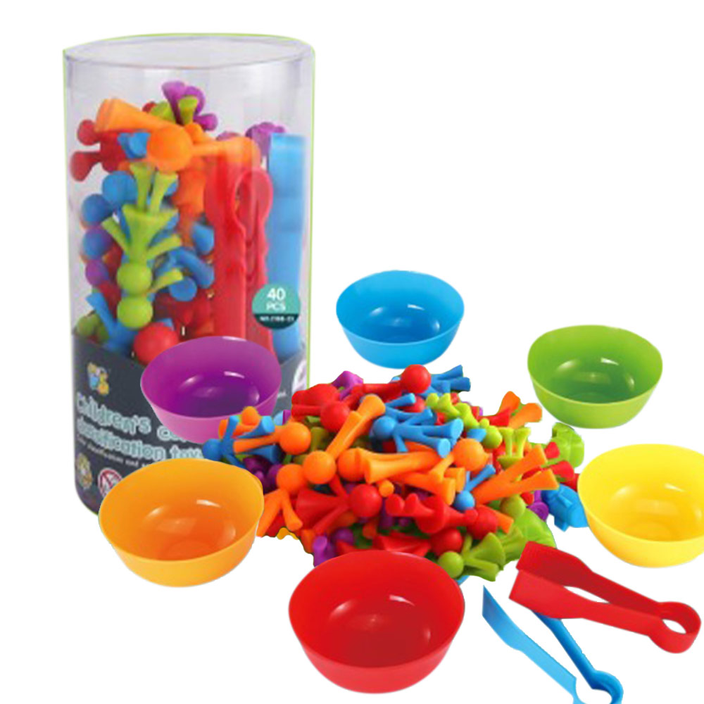 Το σετ περιλαμβάνει 40 πλαστικά κομμάτια σε ζωηρά χρώματα, μικρά μπολ ταξινόμησης και ειδικές λαβίδες για εύκολο πιάσιμο και μεταφορά των αντικειμένων.Τα παιδιά μπορούν να ταξινομούν τα κομμάτια ανά χρώμα, να τα μεταφέρουν με τις λαβίδες και να τα τοποθετούν στα μπολ, ενισχύοντας τον συντονισμό χεριού-ματιού, τη λεπτή κινητικότητα και την αναγνώριση χρωμάτων.