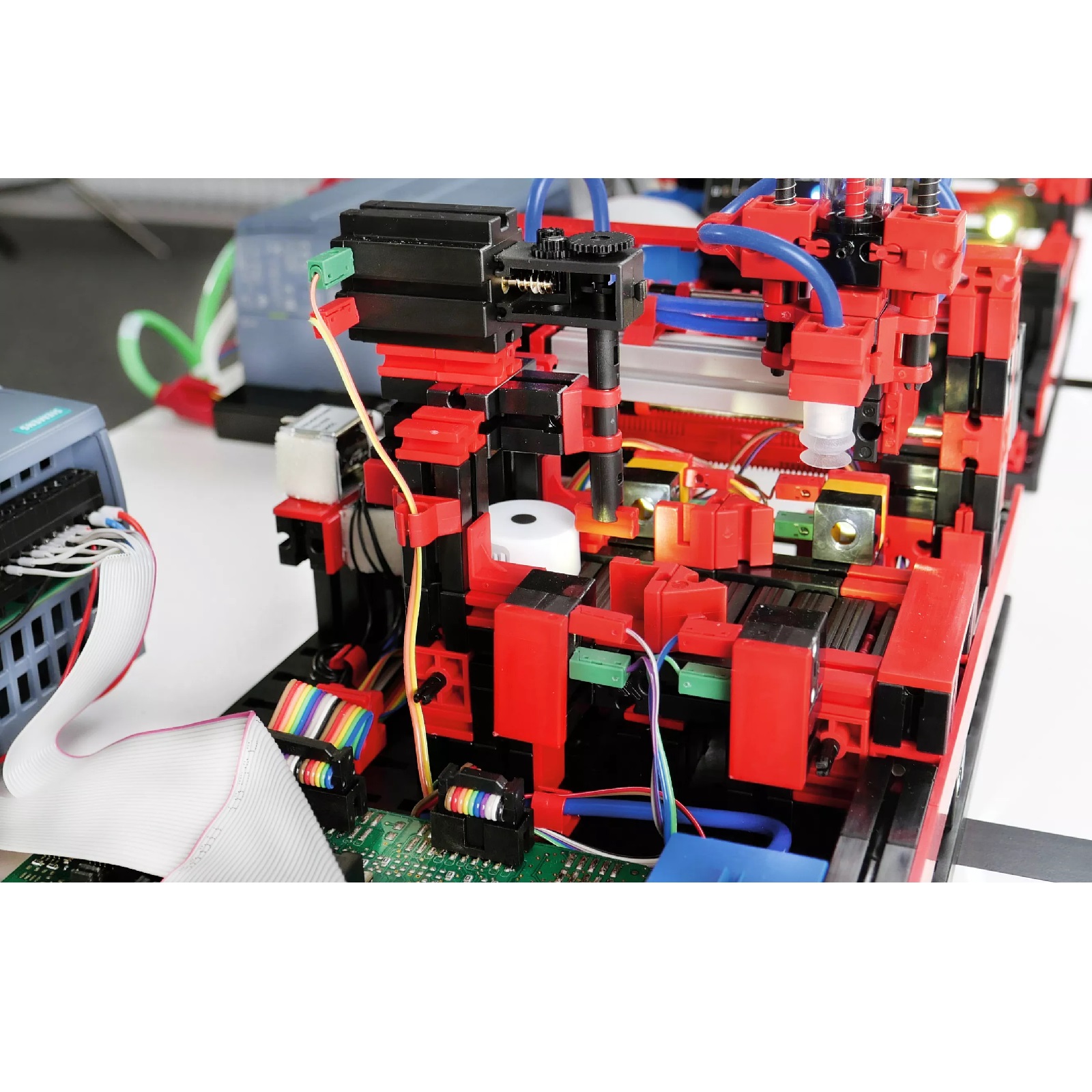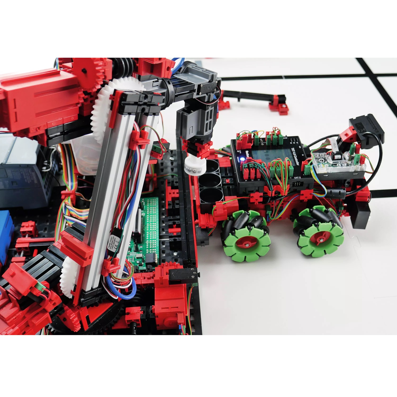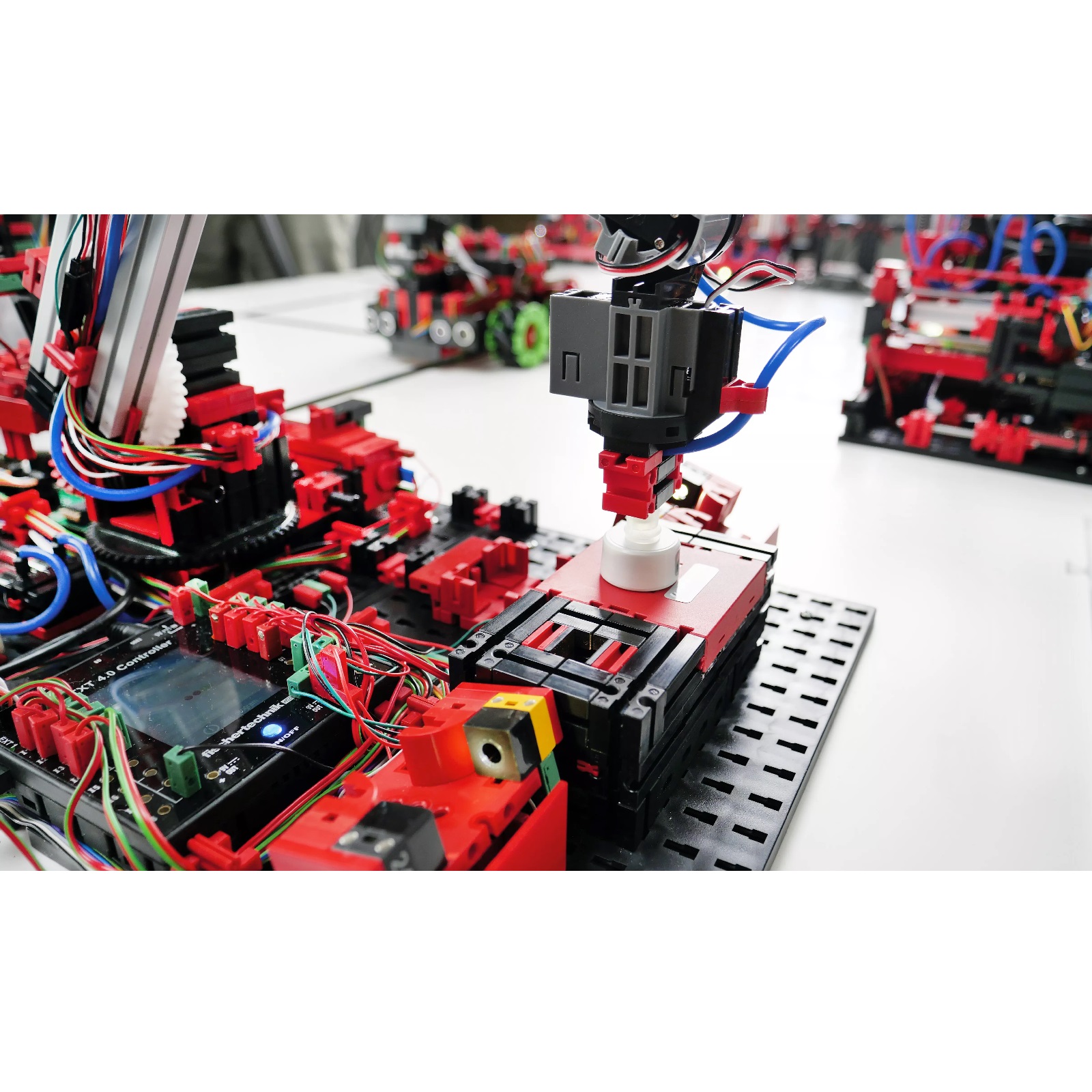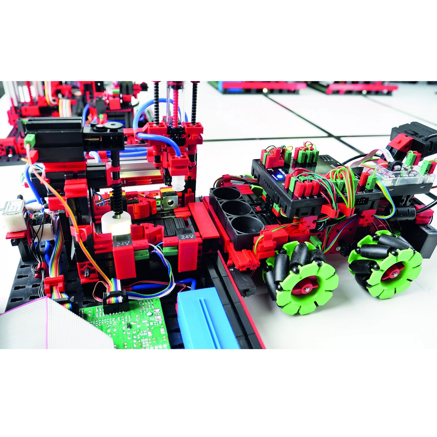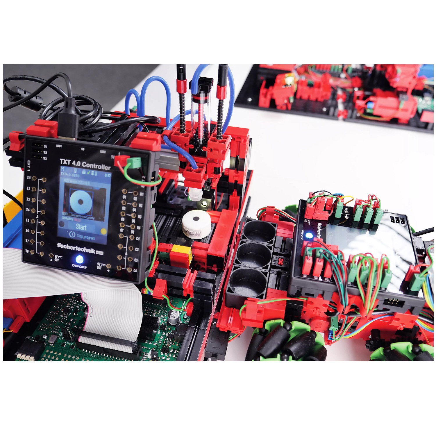 Το εργοστάσιο ελέγχεται από έναν κεντρικό ελεγκτή (Raspberry Pi 4 Model B), ο οποίος είναι δικτυωμένος με τους ελεγκτές των επιμέρους εργοστασιακών μονάδων, PLC Siemens S7 1200 στην έκδοση 24V. Ένα κεντρικό χειριστήριο επικοινωνεί μέσω της τυποποιημένης διεπαφής AGV VDA 5050 και ελέγχει τις παραγγελίες μεταφοράς για το AGV. Το πρωτόκολλο MQTT (Message Queuing Telemetry Transport) χρησιμοποιείται για επικοινωνία. Το εργοστάσιο συνδέεται επίσης μέσω ενός δρομολογητή WLAN με το fischertechnik Cloud, το οποίο περιέχει ένα ηλεκτρονικό κατάστημα για την παραγγελία τεμαχίων εργασίας από τον πελάτη. Επιπλέον, διατίθενται πίνακες εργαλείων για τον έλεγχο παραγγελιών, την απεικόνιση της εργοστασιακής κατάστασης και τον προσδιορισμό των βασικών στοιχείων. Για την προσομοίωση της απομακρυσμένης συντήρησης, οι εικόνες που λαμβάνονται από την κινούμενη κάμερα στο εργοστάσιο εμφανίζονται στον πίνακα εργαλείων, έτσι ώστε η κατάσταση του εργοστασίου να μπορεί να προβληθεί εξ αποστάσεως. Φυσικά, οι πλάκες βάσης των μεμονωμένων μονάδων του εργοστασίου συνδέονται μεταξύ τους μέσω μιας αρχής γλώσσας και αυλάκωσης για να σχηματίσουν μια συνεκτική πλάκα βάσης. Μπορούν να προστεθούν και άλλες μονάδες στα ανοιχτά άκρα και να διαμορφωθούν στον πίνακα εργαλείων. Το συνοδευτικό διδακτικό υλικό προσφέρει αναλυτική εισαγωγή στον χειρισμό του εργοστασίου καθώς και εκτενές διδακτικό υλικό. Τα περιεχόμενα περιλαμβάνουν τα βασικά του Industry 4.0, σπονδυλωτή παραγωγή, έξυπνη δικτύωση, οργάνωση ανθρώπινης τεχνολογίας, Digital Twin, αξιολόγηση δεδομένων αισθητήρων σε πραγματικό χρόνο και πολλά άλλα.Περιεχόμενα: