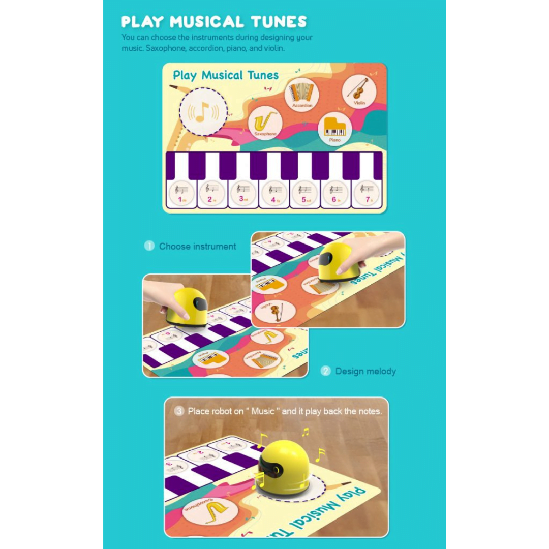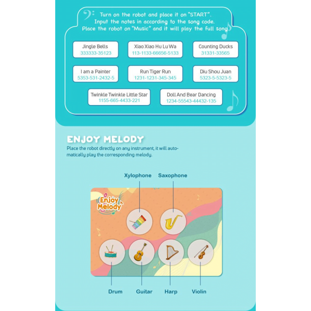 Music: Φτιάξτε την δική σας μελωδία και δημιουργήστε μουσική αναπτύσσοντας έτσι το ενδιαφέρον και την αγάπη των παιδιών για την μουσική. Παίξτε μουσικές νότες: Καθώς σχεδιάζετε την μουσική σας υπάρχουν 4 διαφορετικά μουσικά όργανα (σαξόφωνο, ακορντεόν, πιάνο και βιολί) που μπορείτε να επιλέξετε. Απολαύστε μελωδίες: Για να ακούσετε διαφορετικές μελωδίες, τοποθετήστε το ρομπότ απευθείας πάνω στα μουσικά όργανα και θα αρχίσει να παίζει αυτόματα την αντίστοιχη μελωδία κάθε οργάνου.