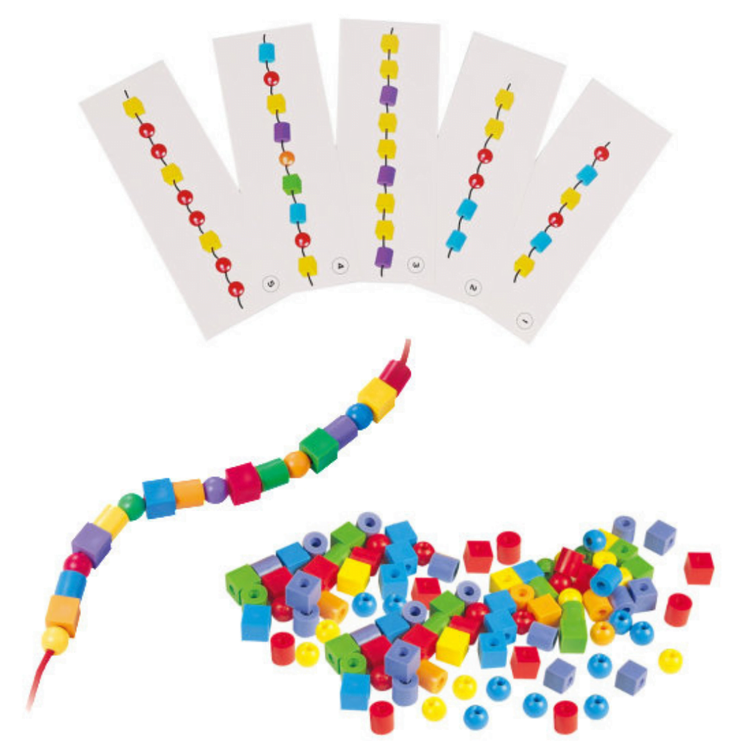Gigo Φτιάχνω Μοτίβα Η δημιουργία μοτίβων είναι σημαντική για τους μαθητές και βασική δραστηριότητα στο νηπιαγωγείο και σε όλες τις τάξεις του δημοτικού σχολείου. Από όλες τις νοητικές ικανότητες, η αναγνώριση προτύπων έχει την υψηλότερη συσχέτιση με τη γενική νοημοσύνη. Η αναγνώριση προτύπων είναι η ικανότητα να αναγνωρίζουν την τάξη σε ένα χάος. Η ικανότητα να αναγνωρίζουν, να εντοπίζουν και να δημιουργήσουν μοτίβα όχι μόνο υποστηρίζει την μάθηση των μαθηματικών, συμβάλλει επίσης στην ευρύτερη κοινωνική ανάπτυξη. Με την κατανόηση των προτύπων, τα παιδιά είναι σε θέση να κάνουν προβλέψεις για το τι θα πρέπει να έρθει επόμενο. Σχεδόν κάθε επιθυμητό επάγγελμα απαιτεί δεξιότητες αναγνώρισης προτύπων. Το κουτί περιέχει 300 χάντρες σε 3 διαστάσεις: σφαίρα, κύλινδρο, κύβο και σε 6 χρώματα. Επίσης, διατίθενται 6 χρωματιστά κορδόνια για τη δημιουργία μοτίβων. Ενδεικτικές δραστηριότητες- Τα παιδιά μπορούν να περάσουν τις χάντρες στο κορδόνι και να δημιουργήσουν ένα μοτίβο το οποίο μπορούν να επαναλάβουν μέχρι να γεμίσουν όλο το κορδόνι. Μπορούν να δημιουργήσουν πολλά διαφορετικά μοτίβα. Μέσα από αυτή τη δραστηριότητα αναπτύσσουν και τη λεπτή κινητικότητα, τη λογική ακολουθία και τη μνήμη.