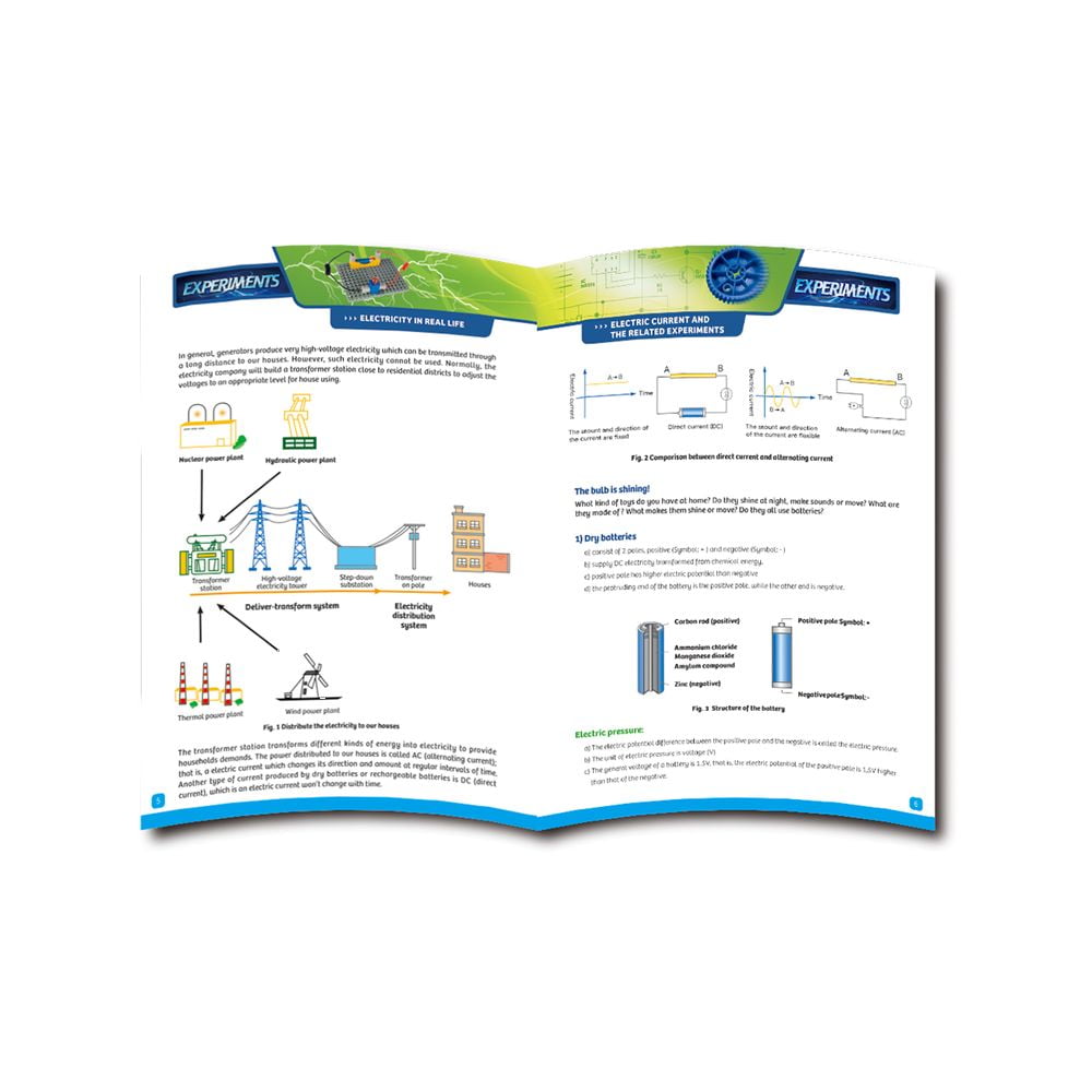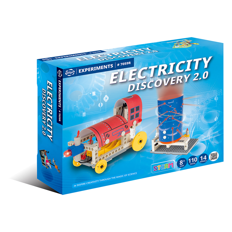 Με το πακέτο Gigo Electricity Discovery 2.0 τα παιδιά κατανοούν τις βασικές αρχές της ηλεκτρικής ενέργειας. Μέσα από τα 10 πειράματα που περιλαμβάνονται θα δημιουργήσουν παράλληλες συνδέσεις, κυκλώματα φωτός και θα τροφοδοτήσουν έναν κινητήρα. Περιλαμβάνει όλα τα δομικά στοιχεία που θα χρειαστούν, όπως καλώδια σύνδεσης, θήκη μπαταρίας και κινητήρα, για να πραγματοποιηθούν οι κατασκευές με ασφάλεια, μέσα από το εγχειρίδιο με τις οδηγίες και τις επεξηγήσεις των αρχών και των μοντέλων. Με αυτό το πακέτο μπορείτε να κατασκευάσετε ένα φωτιζόμενο τρένο, ένα υποβρύχιο, ένα κύκλωμα με φορά του μοτέρ αριστερόστροφη και δεξιόστροφη, ένα κύκλωμα εν παράλληλα, μια κινούμενη πασχαλίτσα, ένα περιστρεφόμενο και φωτιζόμενο καρουζέλ με αστερισμούς, ένα κύκλωμα σε σειρά και ένα σε παράλληλη σύνδεση, ένα περιστρεφόμενο έλικα με γλάρους, ένα κύκλωμα με αγωγό και μονωτή, ένα πύργο ελέγχου με ραντάρ, ένα μοτέρ ταχύτητας, μια οπτική ψευδαίσθηση, ένα κύκλωμα που ανάβει μια λάμπα, ένα φωτιζόμενο ελικόπτερο. Χρειάζεται 2 μπαταρίες ΑΑ (δεν συμπεριλαμβάνονται).